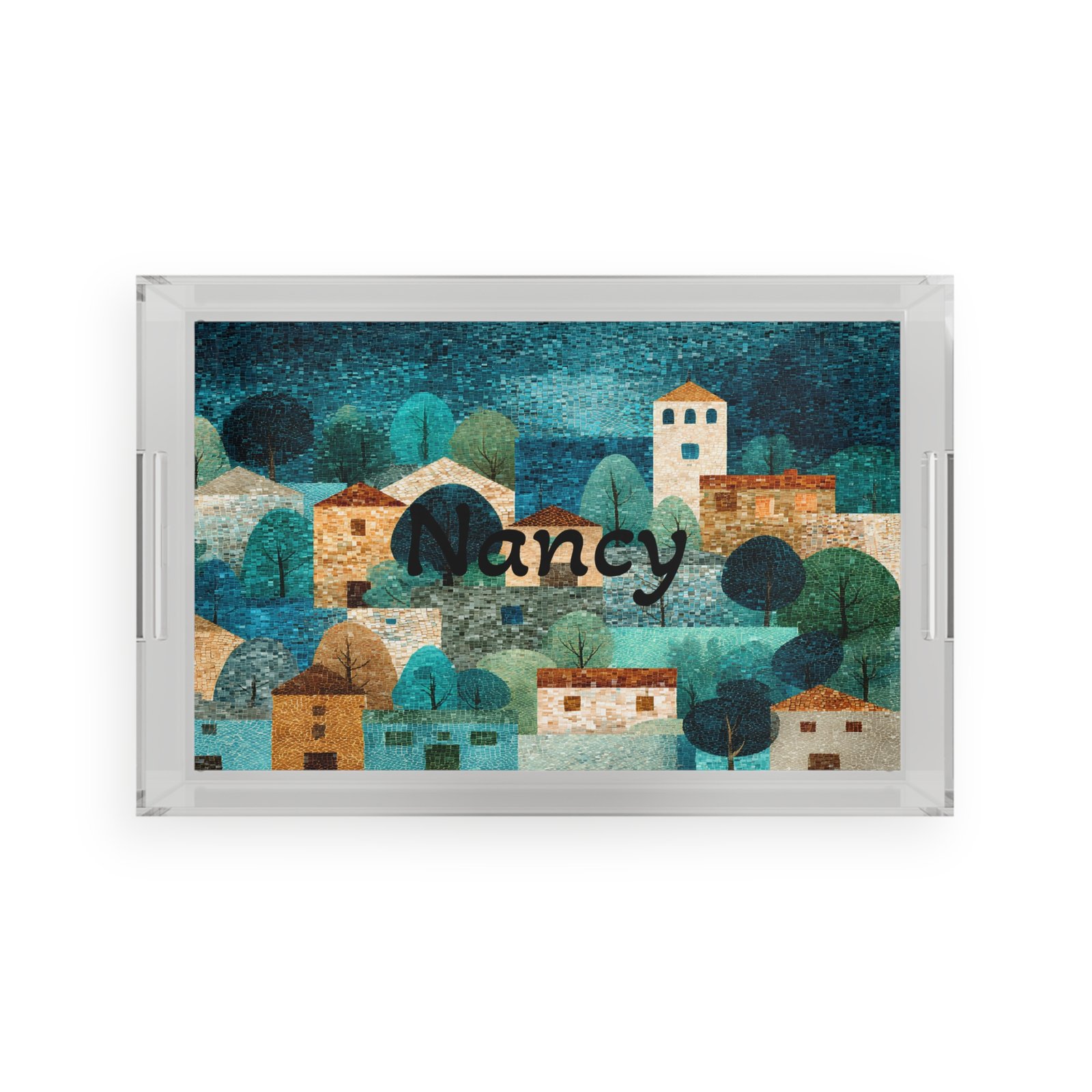 Add a custom character to any business or home with a personalized serving tray. This personalized photo serving tray is assembled in the USA and comes in an 11″ x 17″ size. Your ideas are printed on a high-quality, laminated artwork insert that goes into the tray’s base. Lastly, this personalized serving tray with handles is easy to carry and is great for both home and professional use.