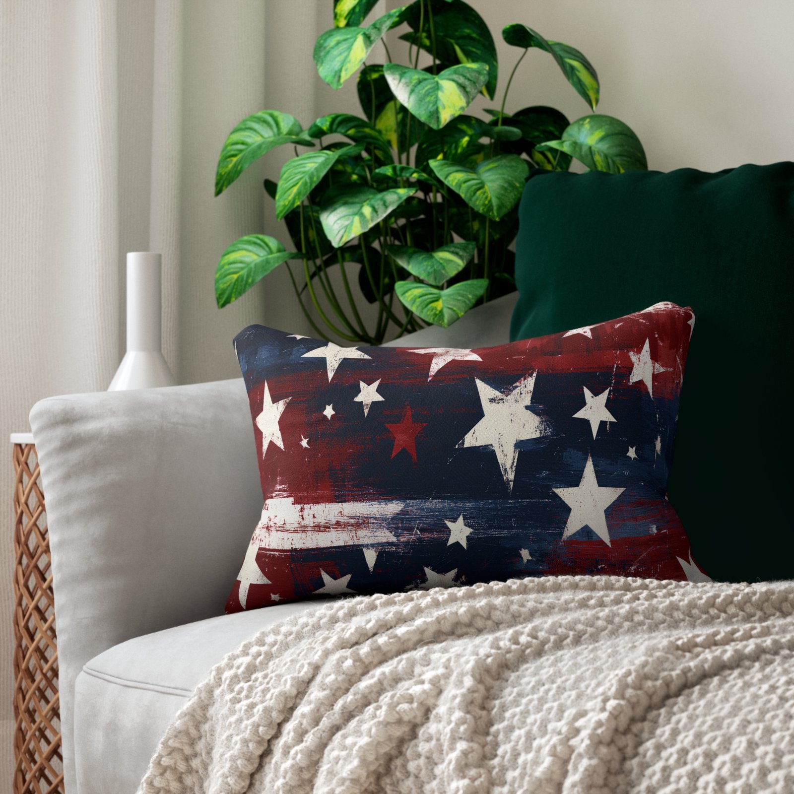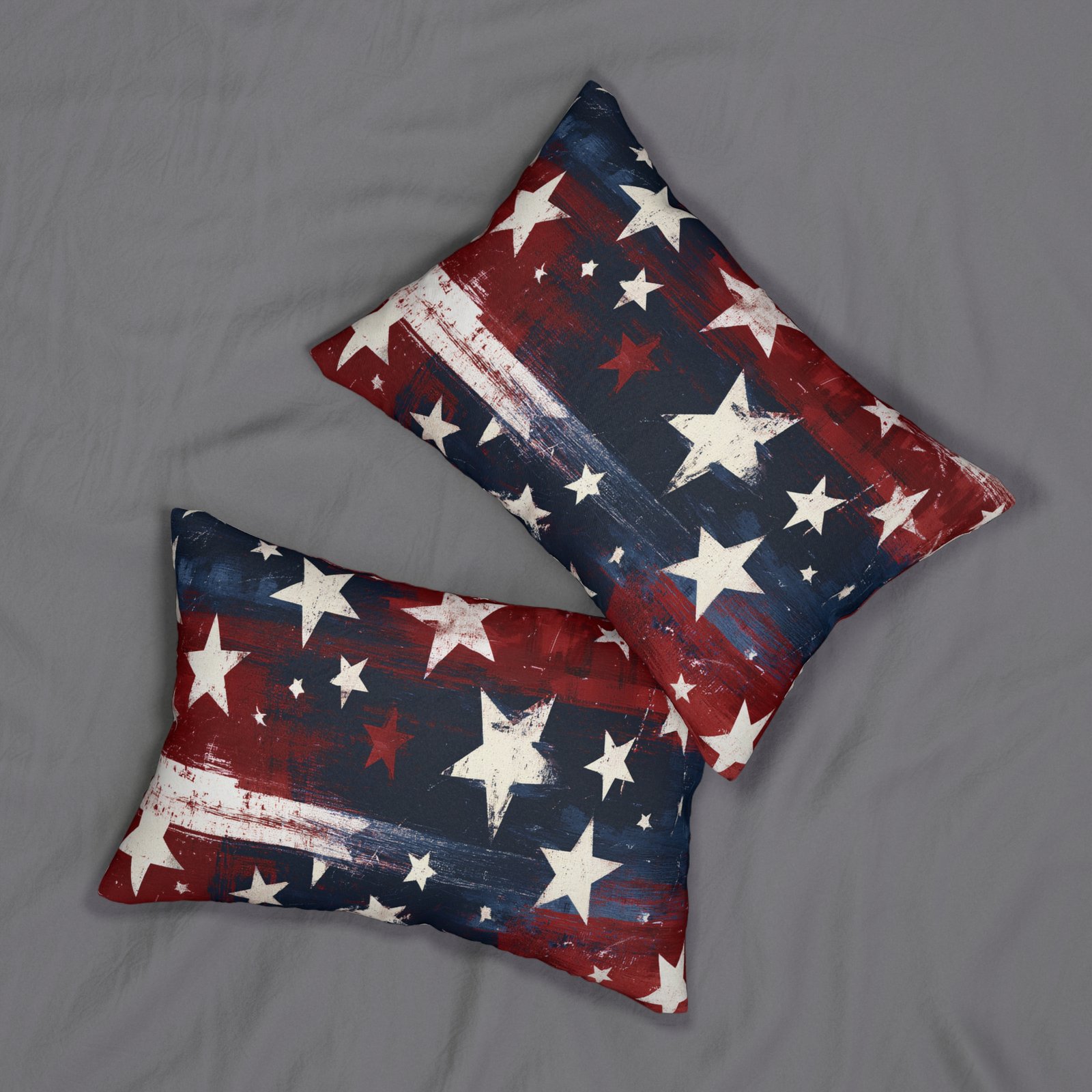 Soft, rectangular lumbar pillow wrapped in a painterly American-flag design. The distressed stars and brushed red, white, and blue strokes bring a lived-in, vintage vibe — like beach bonfires and late summer parades. It settles at your lower back to add color and comfort to a porch bench, camper interior, or cozy sofa. The cover zips off for easy care and the recycled-poly insert keeps the shape resilient while still feeling plush against your lumbar. Display it on a wicker chair or tuck it into a reading nook to quietly echo patriotic charm without shouting.