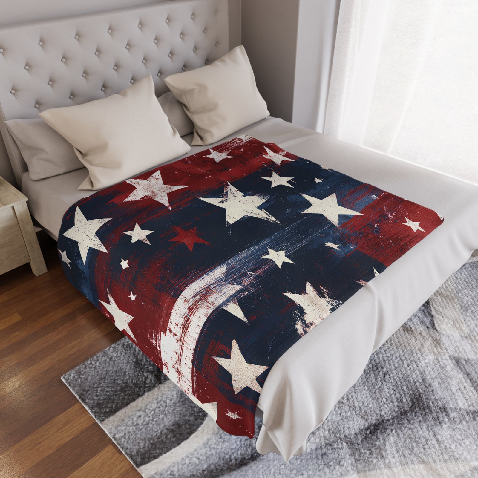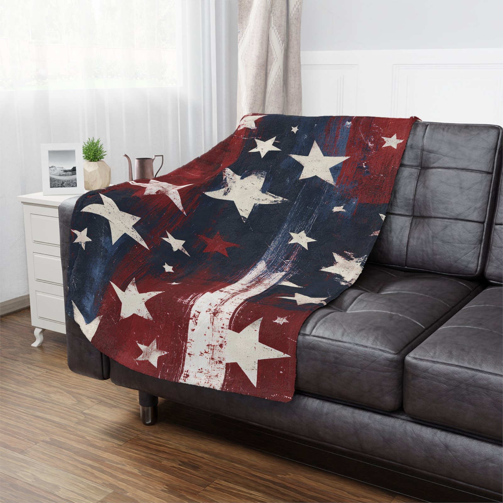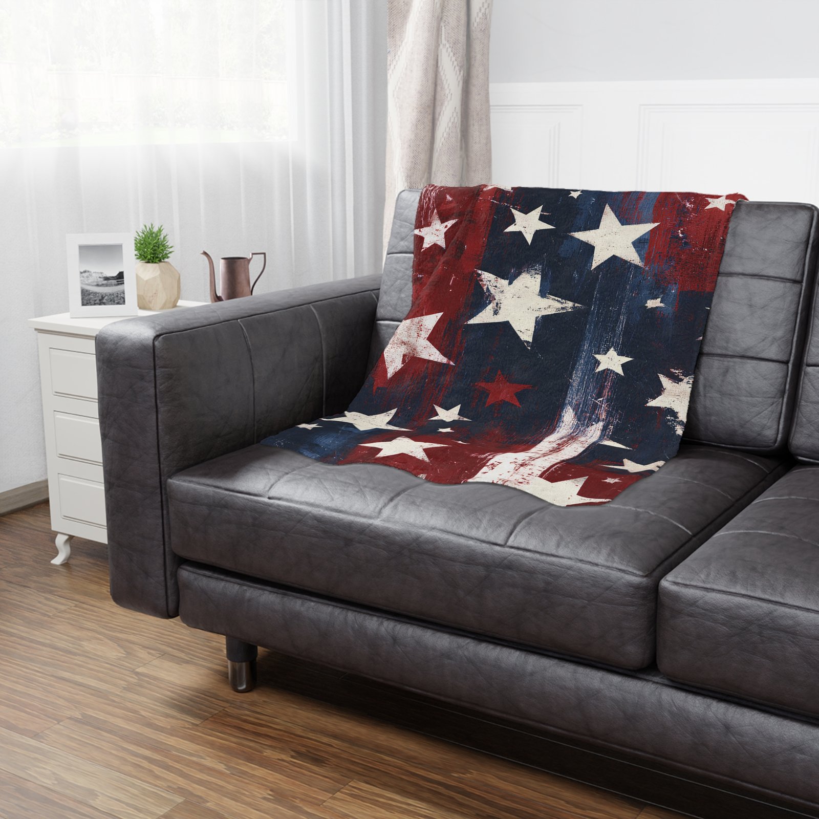 The design reads handcrafted and familiar — distressed brush strokes and scattered stars that look hand-painted. It complements farmhouse sofas, rustic cabins, and eclectic living rooms. Bring it out for backyard BBQs, Memorial Day gatherings, or quiet weekday moments when you just want to feel held.