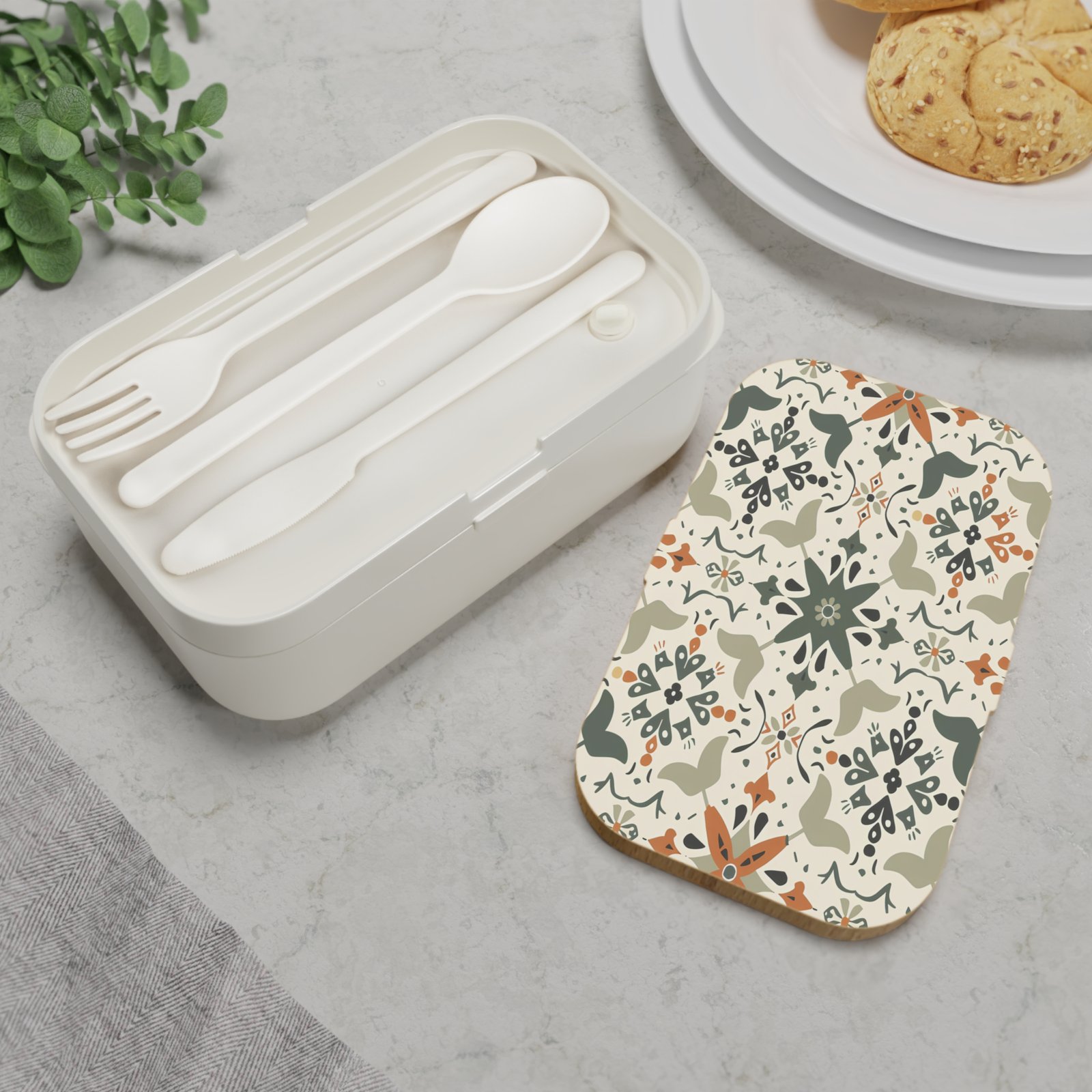 This compact bento brings daily lunches to life with artisan-inspired patterning and thoughtful functionality. The wooden lid carries a crisp, vibrant print that gives the box a warm, crafted feeling while the soft silicone tray inside keeps food secure and easy to clean. Two movable dividers let you organize snacks, sides, and mains the way you like, while the included elastic band and cutlery make it simple to grab-and-go. Microwave-safe and BPA-free, this box suits busy weekdays, creative picnics, or packed lunches for childcare and school-aged kids. It feels like a little piece of calm routine — a stylish container that elevates ordinary meals.