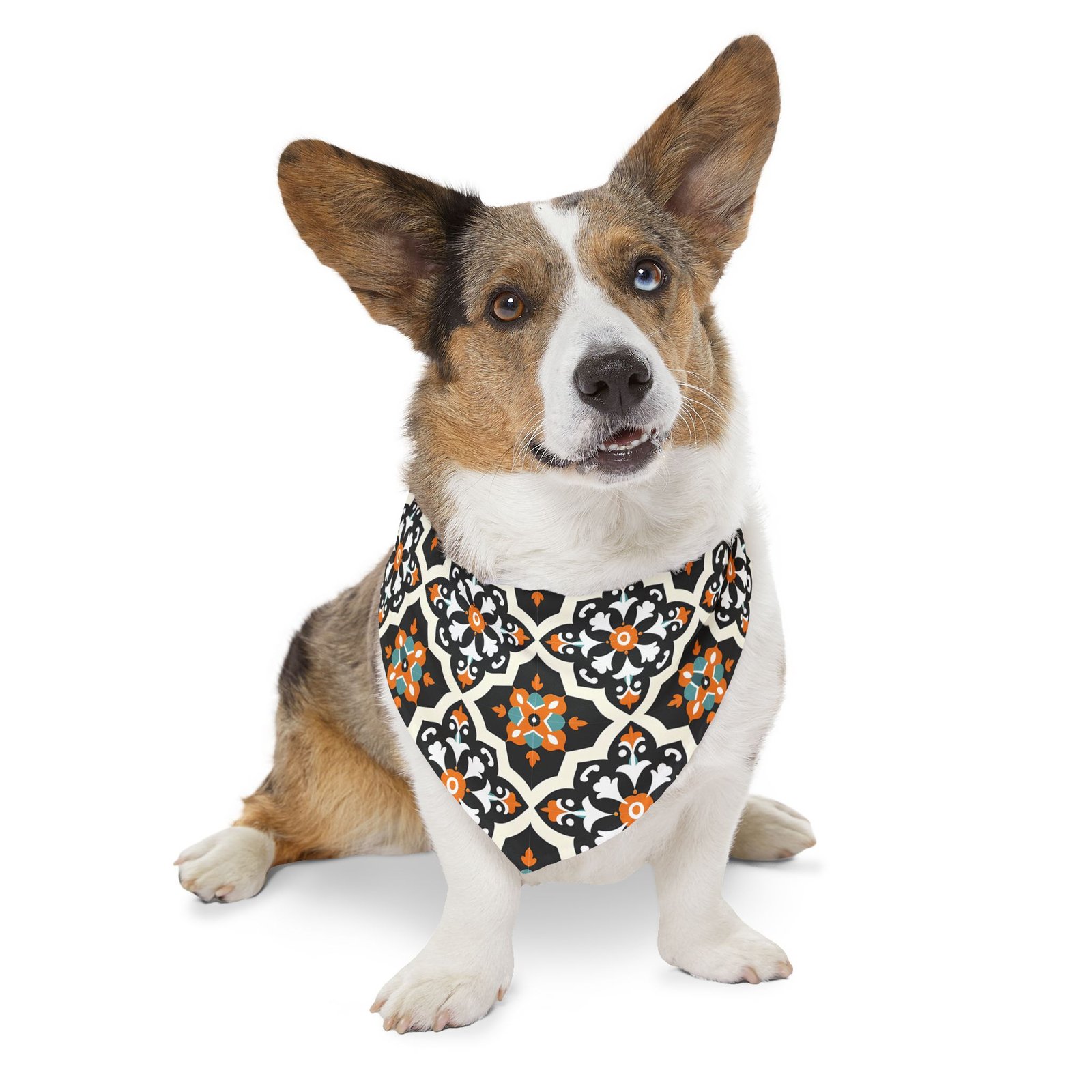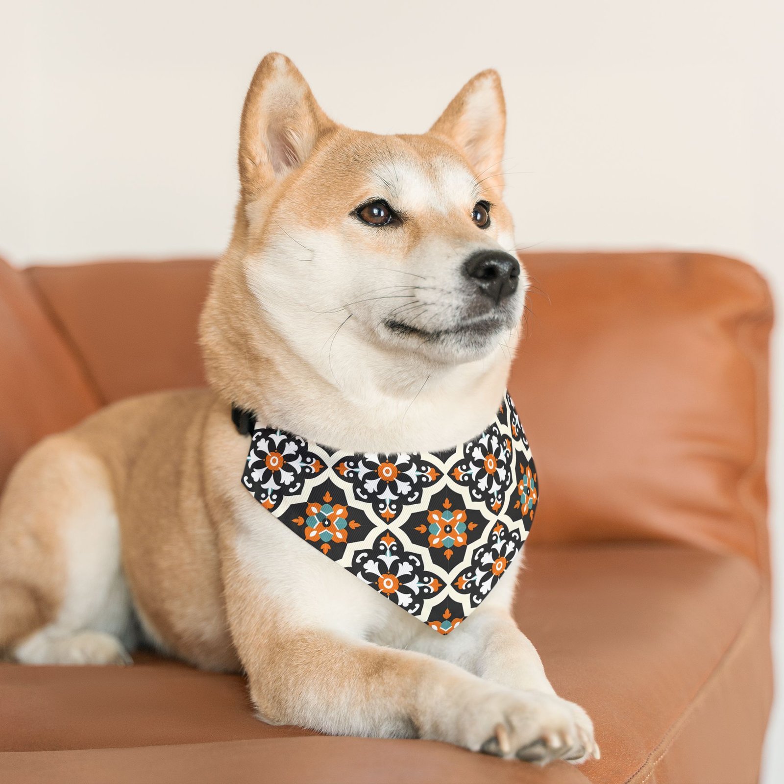 Hand-sewn with care and patterned all over, this lightweight pet bandana collar brings bold tile-inspired geometry to your dog’s daily walks. The vivid orange and teal stars sit inside a repeating black-and-white motif that lifts neutral coats and adds a playful, stylish edge without weighing your pup down. The triangular bandana attaches to an adjustable black collar with a quick-release buckle so you can size it, snap it on, and go. It dries fast and keeps its shape — made to stand up to muddy paws and frequent adventures while still looking crisp for photos and visits.