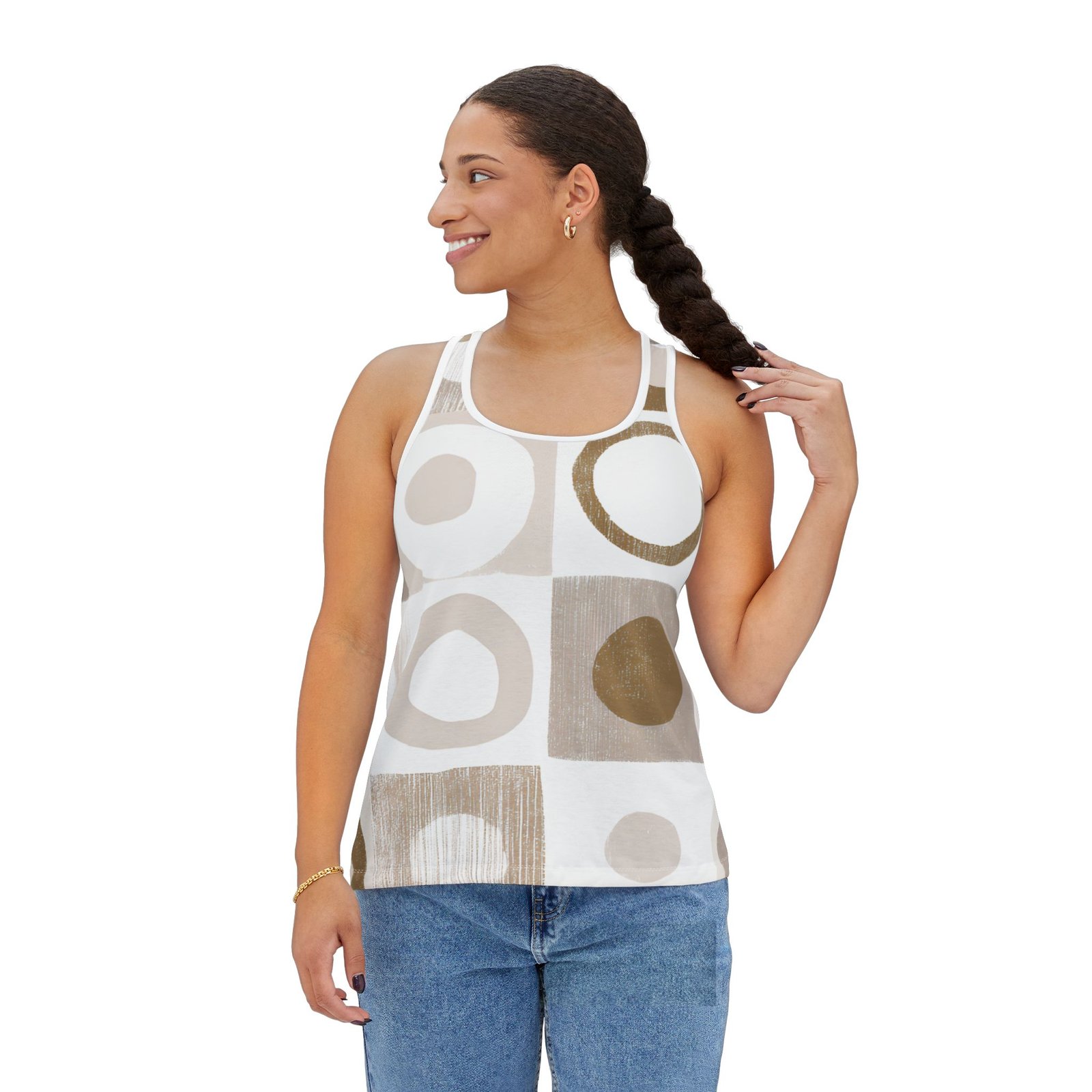 Elevate your summer wardrobe with this stunning Women’s Tank Top. Featuring a unique all-over print with earthy tones and playful designs, this tank top radiates a cool and contemporary vibe. Perfect for sunny days at the beach, casual outings, or cozy nights on the patio, it effortlessly complements any laid-back outfit. Ideal for fashion-forward women looking to express their individuality, this versatile tank is also a fantastic gift for birthdays, Mother’s Day, or just to treat yourself. Embrace style and comfort in every adventure!