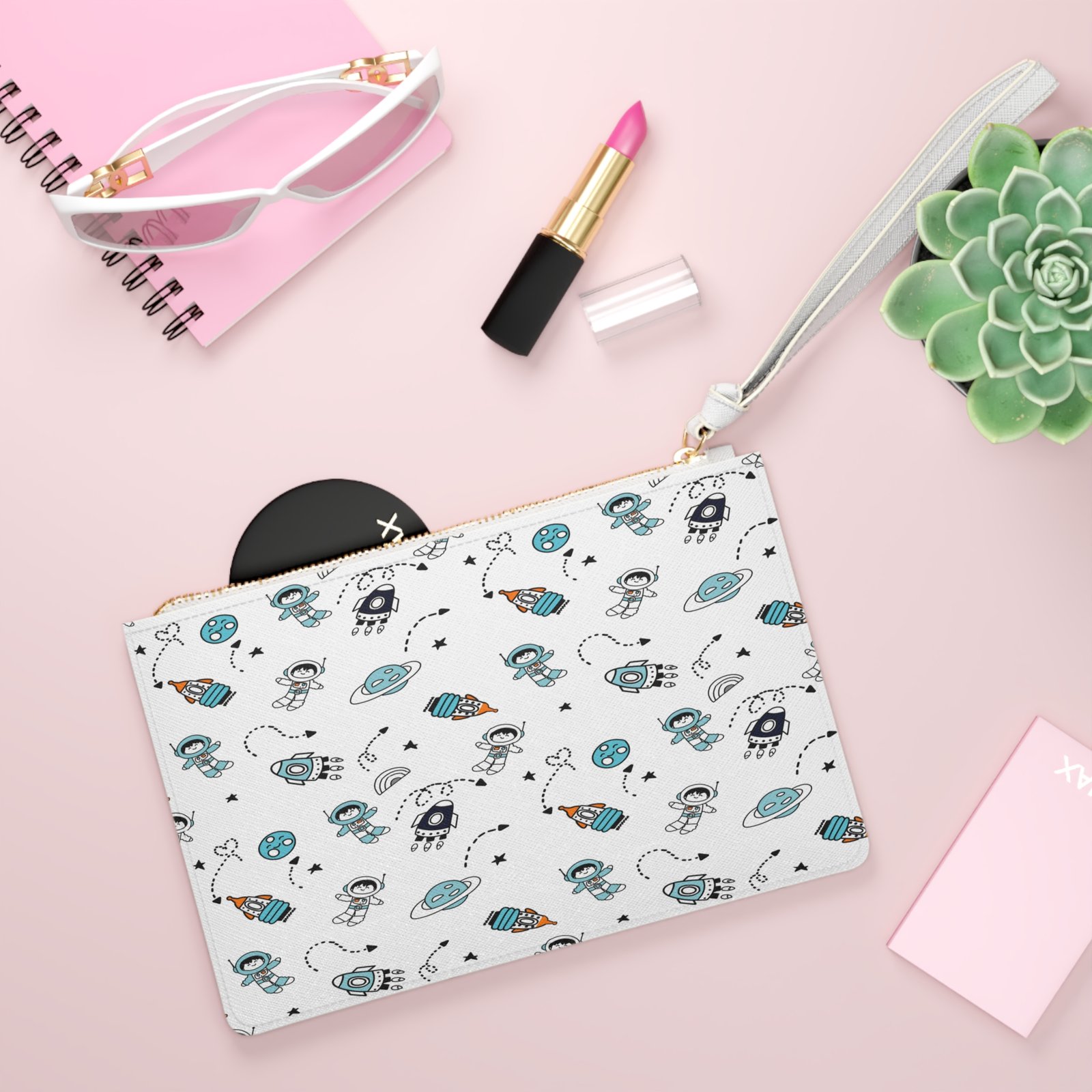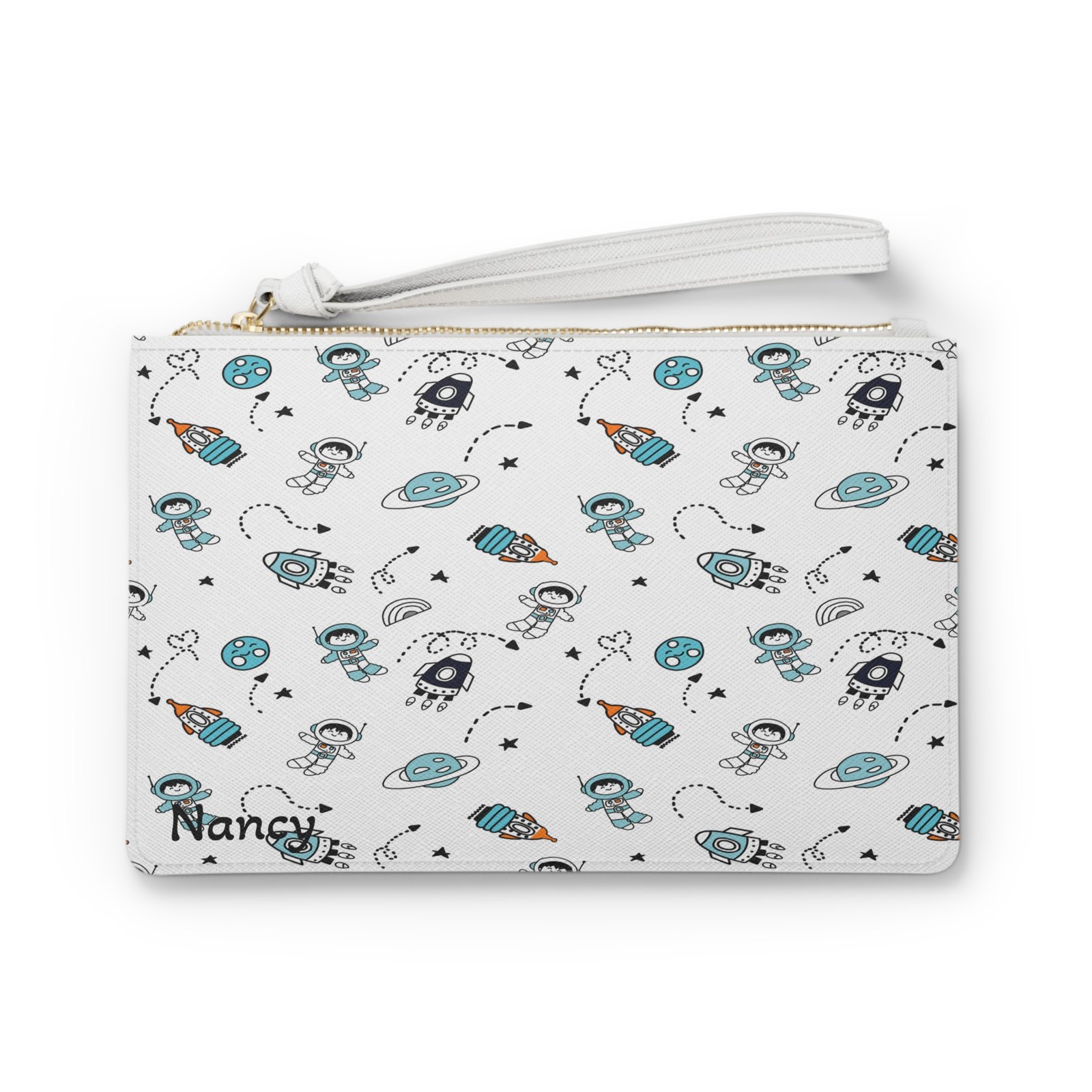 Designed with a loop handle to quickly free your hands, this custom clutch bag is made for the fashionista on the go. It can hold everyday essentials such as a phone, wallet, and keys. It features a zip fastening and a fully lined internal pocket. It is made of vegan leather in the Saffiano pattern finish that was invented by Prada.