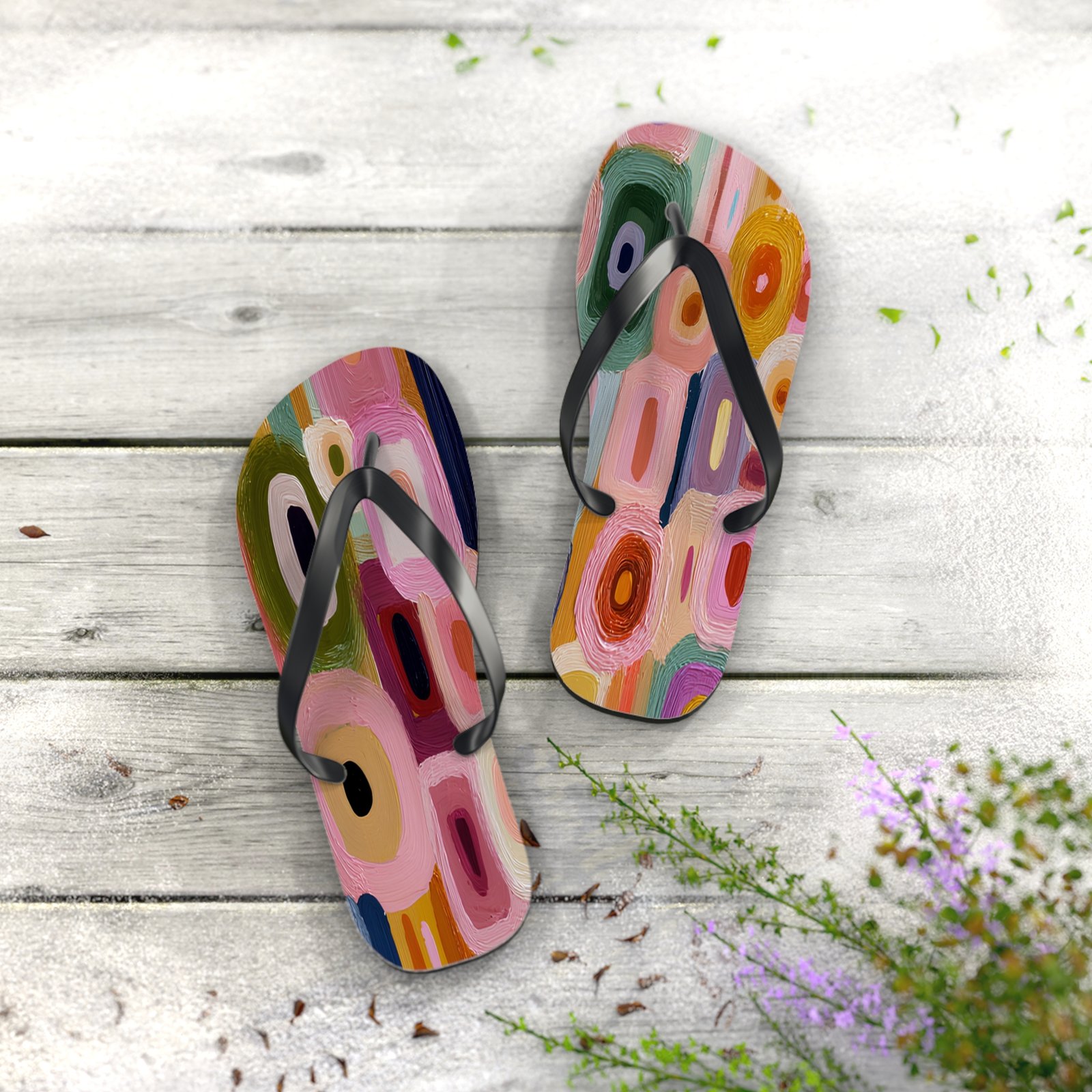 Colorful Art Flip Flops, Summer Sandals, Beach Footwear, Poolside Accessories, Vacation Gear, Boho Chic Slippers