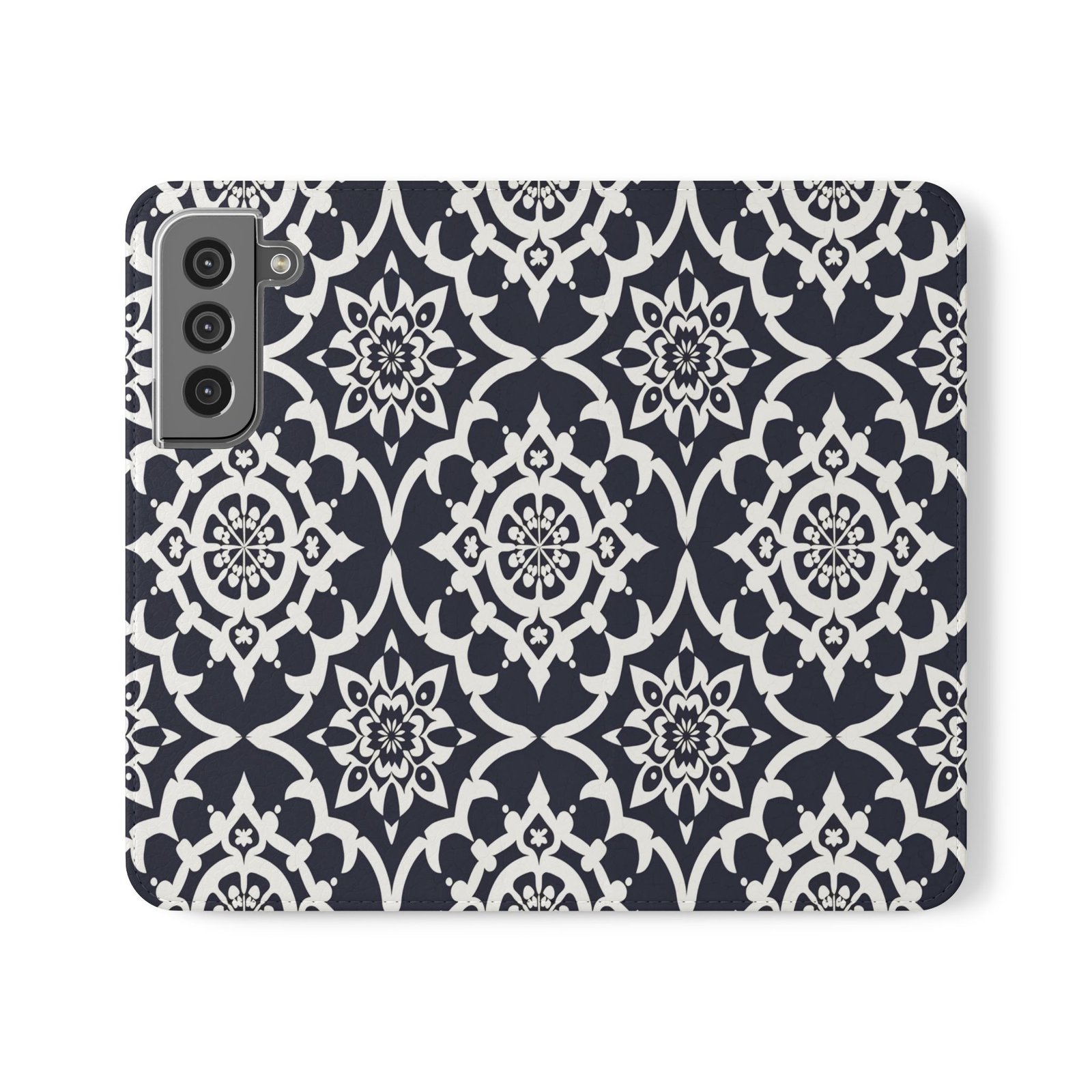 Slip this elegant flip case into your day and feel the quiet confidence of well-made design. The supple vegan leather cover wears a timeless navy-and-ivory medallion pattern that reads as both vintage and modern. Inside, stitched card slots tuck a few essentials away; the polycarbonate cradle holds your phone snug and the fold-out stand angles the screen for videos or hands-free calls. A discreet D-ring option for S24/S25 models lets you clip on a strap for commuting or travel. Thoughtful touches — clear port access, flat elastic fastening, and included care instructions — keep everyday use simple and graceful. Made in South Korea with cruelty-free materials, it suits someone who values style, function, and mindful craftsmanship.