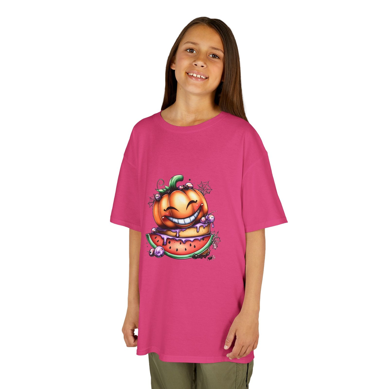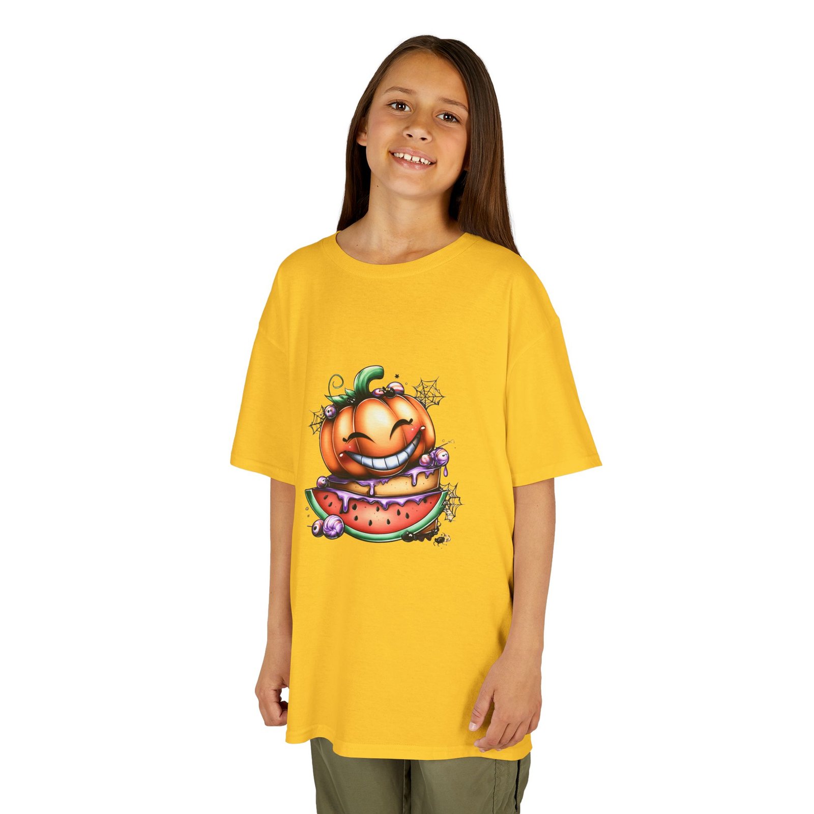 The kids heavy cotton tee is perfect for everyday use. The fabric is 100% cotton for solid colors. Polyester is included for heather-color variants. These fabrics are prime materials for printing. The shoulders have twill tape for improved durability. The collar is curl resistant due to ribbed knitting. There are no seams along the sides.