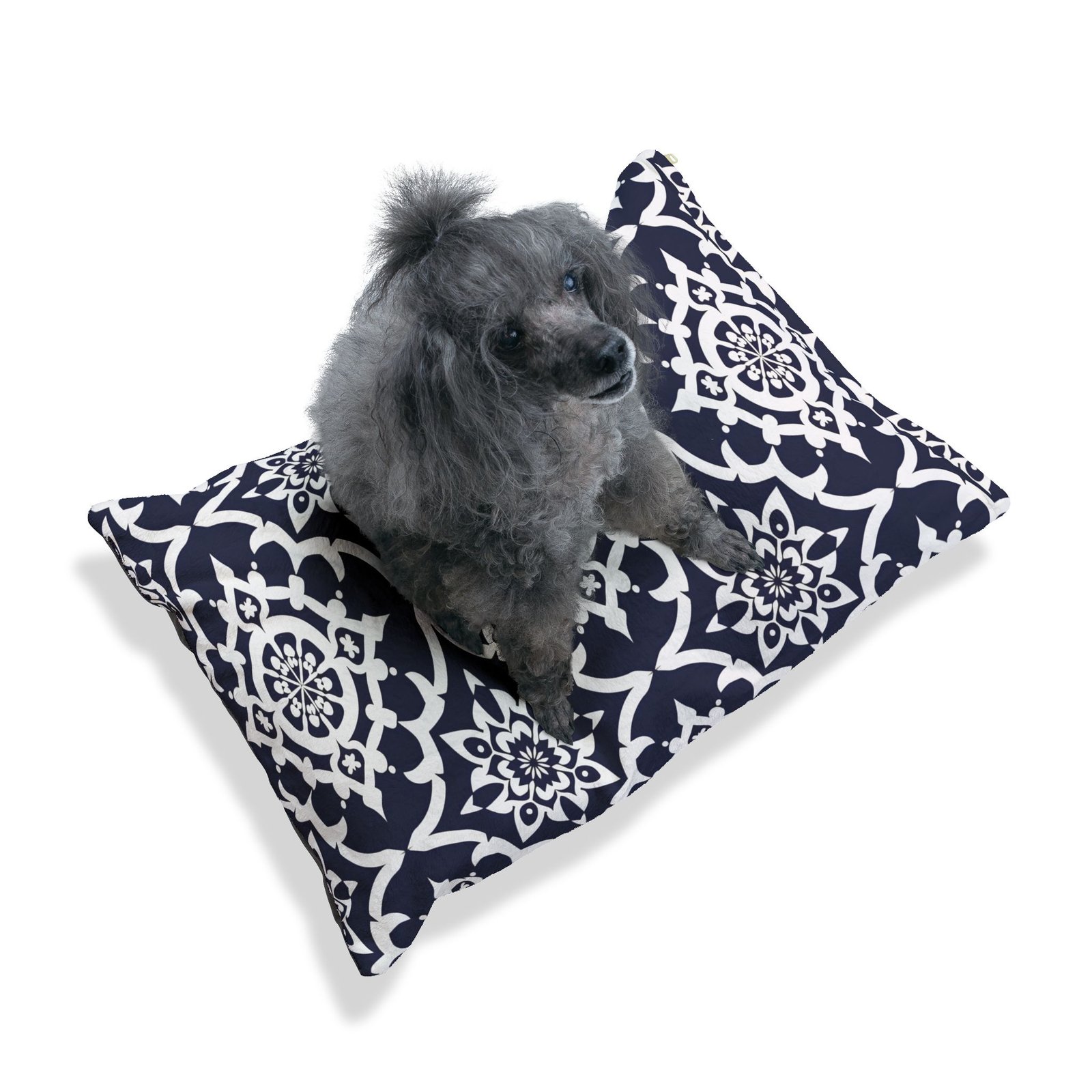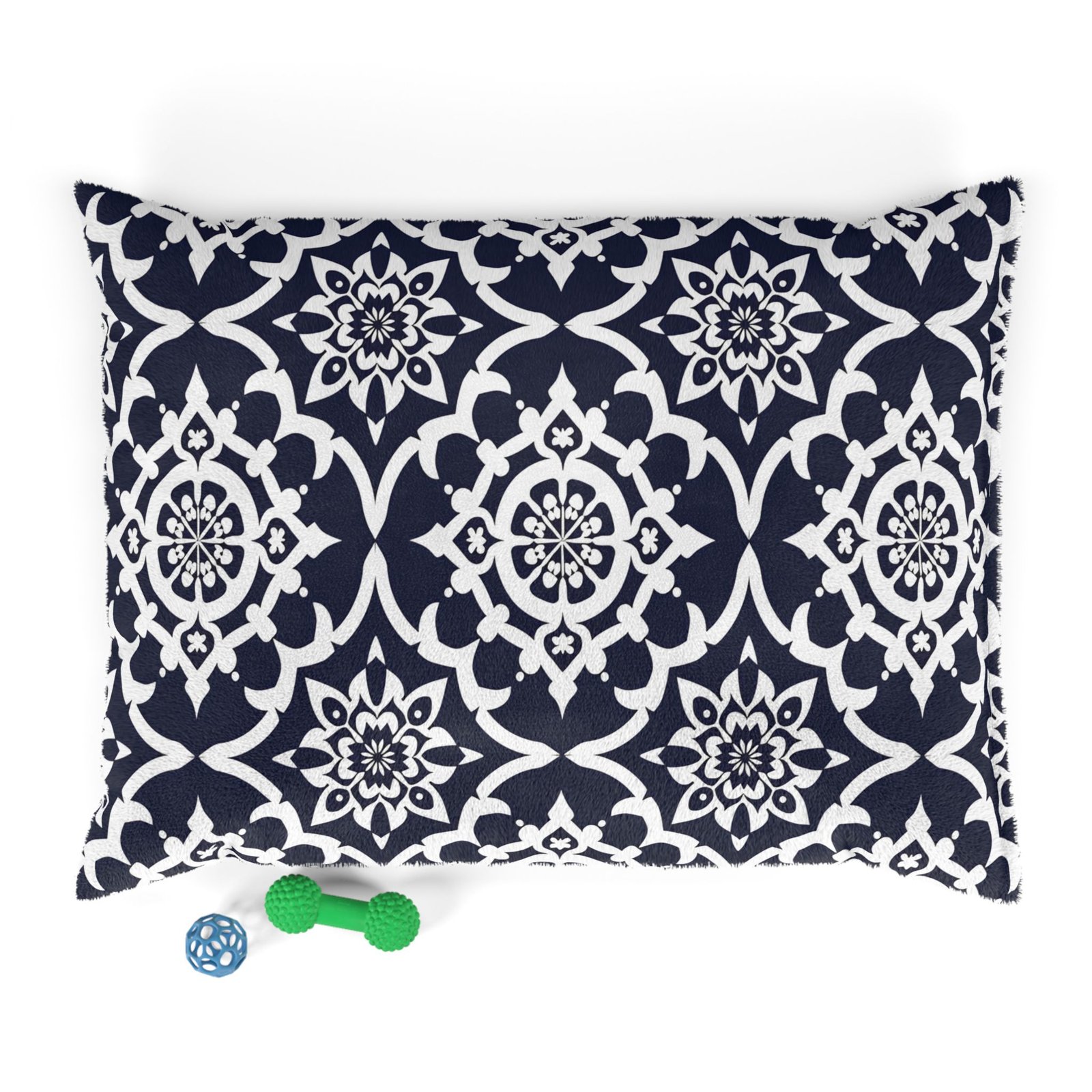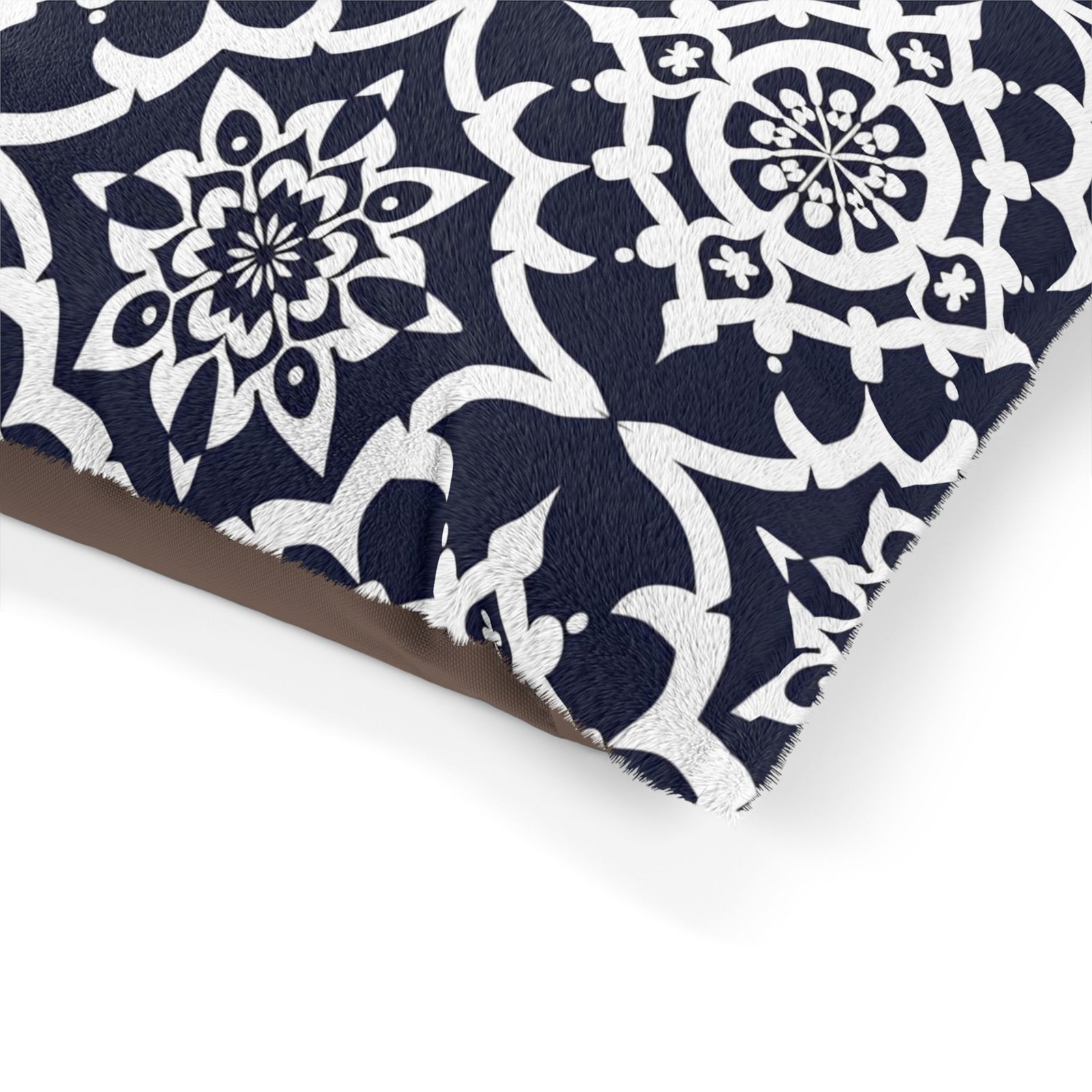 A cozy, stylish pet bed designed to bring home both comfort and visual charm. The plush coral fleece top welcomes naps with soft warmth, while the sturdy cotton duck underside keeps the bed grounded and durable. A removable, zippered cover makes cleanup simple so the bed stays fresh through everyday use. The bold navy-and-white tile pattern adds a touch of modern farmhouse flair that blends with living rooms, entryways, or sunlit porches. Available in multiple sizes with a shape-retaining insert that supports lounging, this indoor pet bed creates a calm, familiar spot your pet will return to throughout the day.