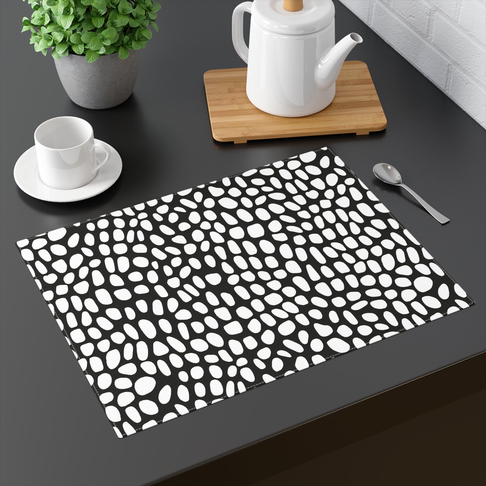 Elevate your dining experience with this stylish placemat, designed to bring a touch of modern elegance to your table setting. Crafted from 100% cotton twill, it offers a vintage charm while being extremely durable. The unique one-sided print in a chic black and white pattern adds a contemporary vibe, making it perfect for casual meals and special occasions alike. Ideal for those who appreciate sophistication in their home décor, this placemat is a must-have for anyone looking to spruce up their dining area. Perfect for housewarming gifts, holiday gatherings, or any celebration that calls for a stylish touch at mealtime. Make your dining table the center of attention with this delightful addition!