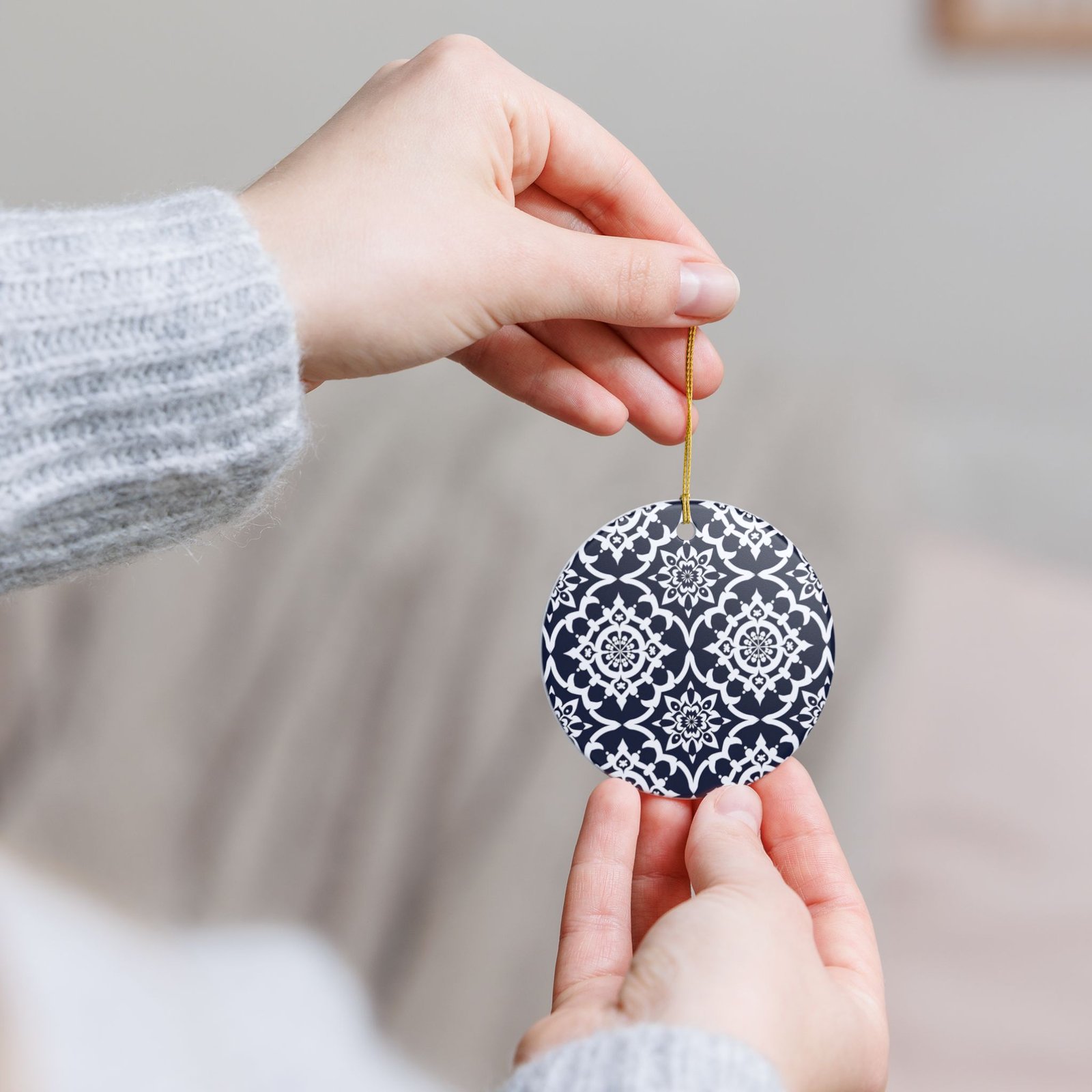 This round ceramic ornament brings calm, classic patterning to holiday trees and year-round display. A deep navy background holds crisp white medallions in a repeating tile motif—clean, timeless, and slightly vintage. The gloss ceramic face contrasts with a matte-printed design for subtle texture. Lightweight yet sturdy, it hangs from the included gold string and shows the design on both sides so it reads from any angle. Tuck it into a seasonal arrangement, hang it from a doorknob or window, or include it with a gift to add a thoughtful, hand-curated touch.