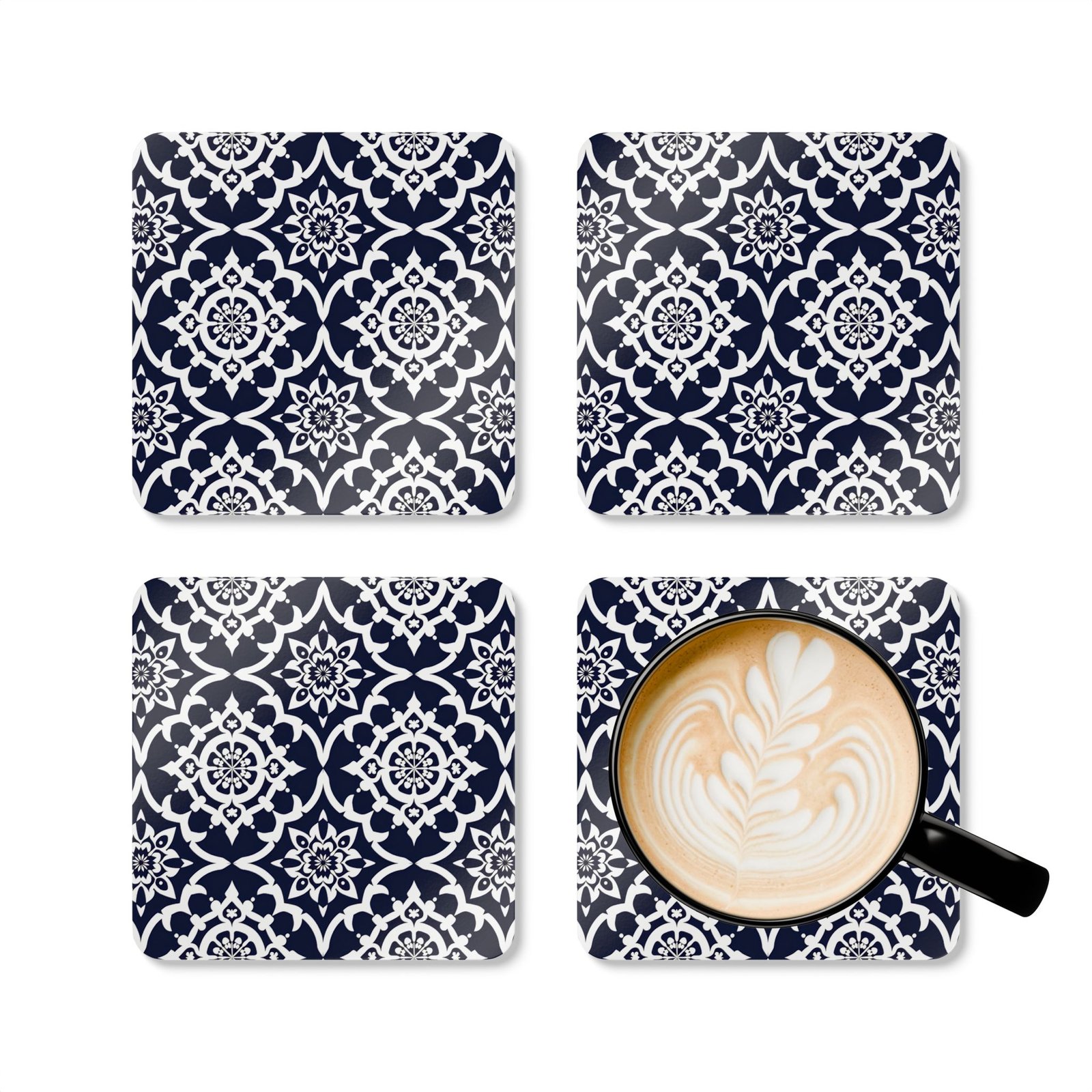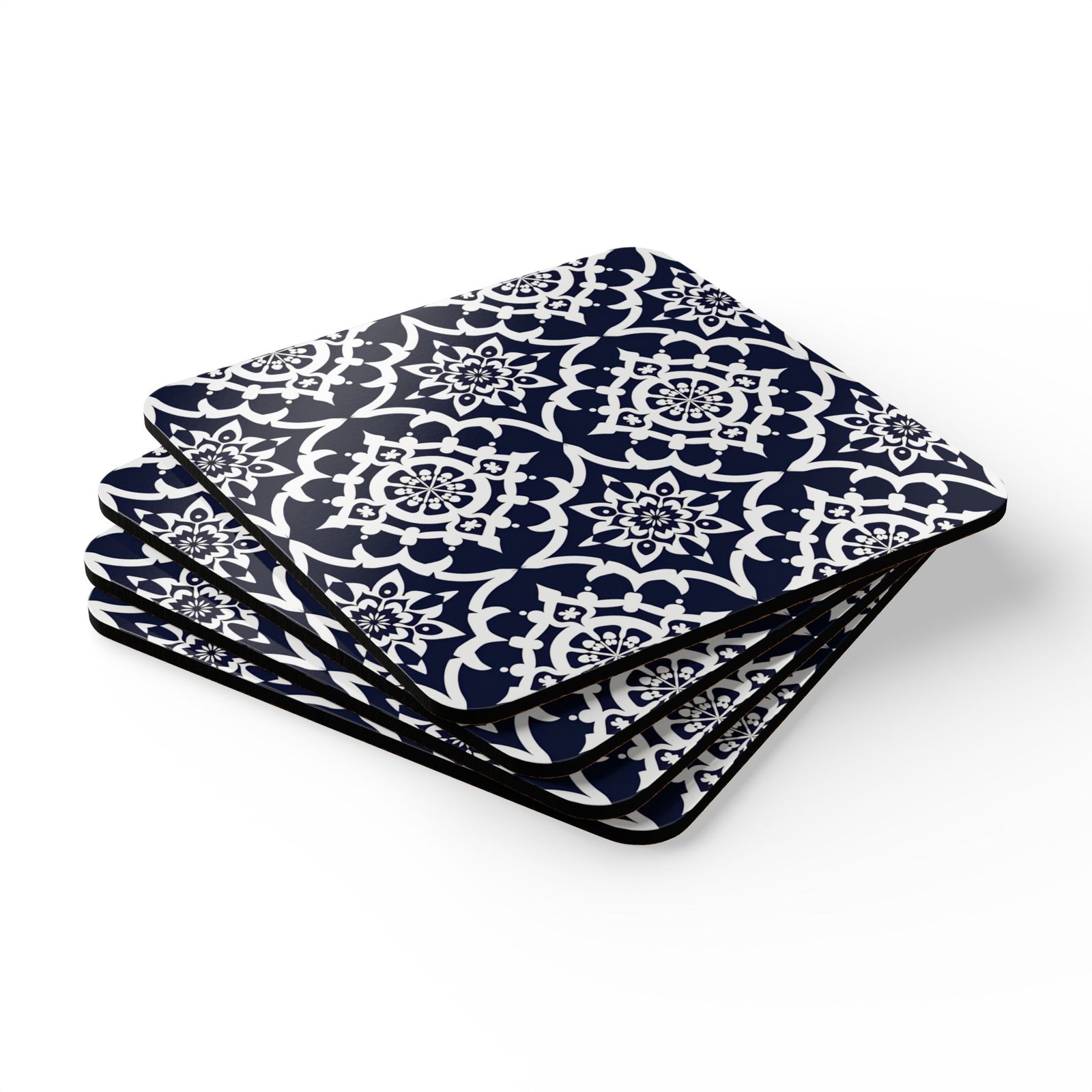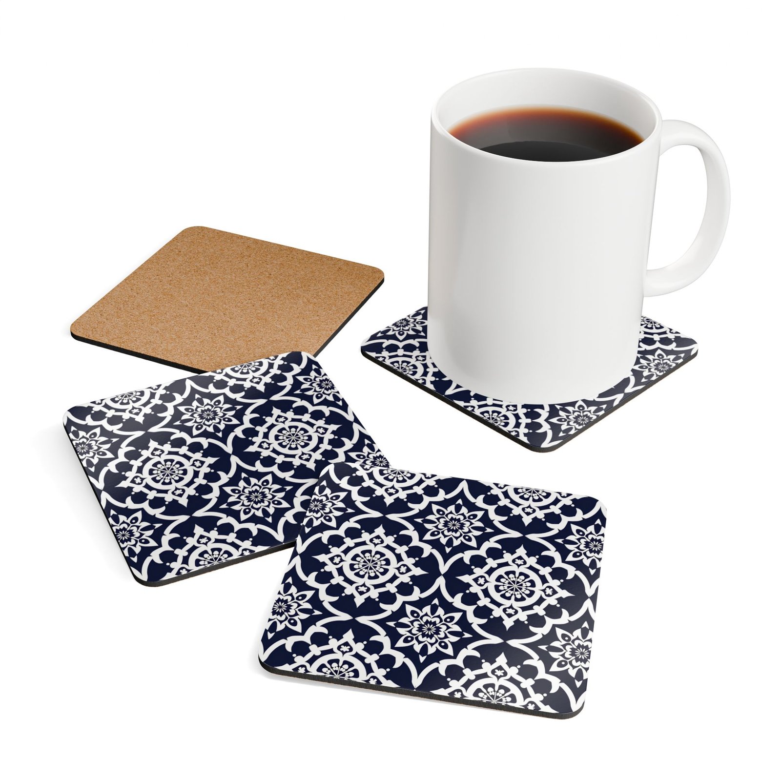 These square cork-backed coasters bring quiet charm to everyday tables. The glossy, high-definition top highlights a deep navy pattern that reads like hand-drawn tilework — crisp white motifs set against rich indigo that catches light and conversation. At a slim 0.16″ thickness they sit low and unobtrusive, protecting surfaces without bulk. The natural cork underside grips gently to keep each piece in place while the vibrant printed face resists fading, so the pattern keeps looking fresh through coffee breaks, cocktail hours, and slow weekend mornings. Sold as a set of four, they arrange neatly under mugs, glasses, and small vases, adding a subtle, crafted touch to kitchen counters, office desks, or living-room side tables.