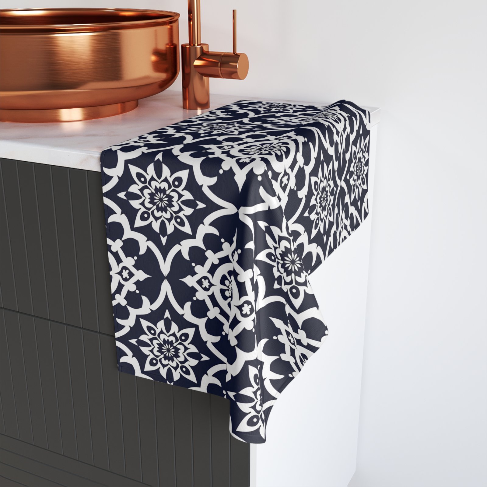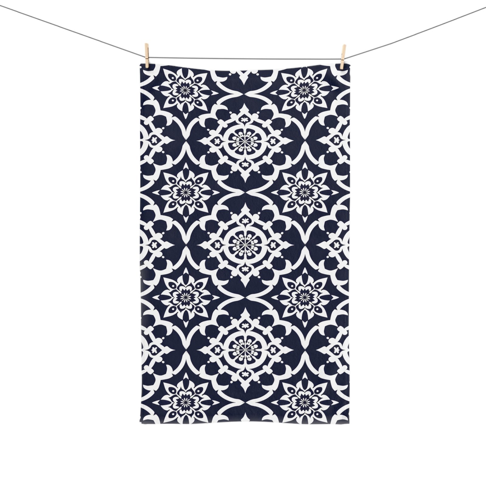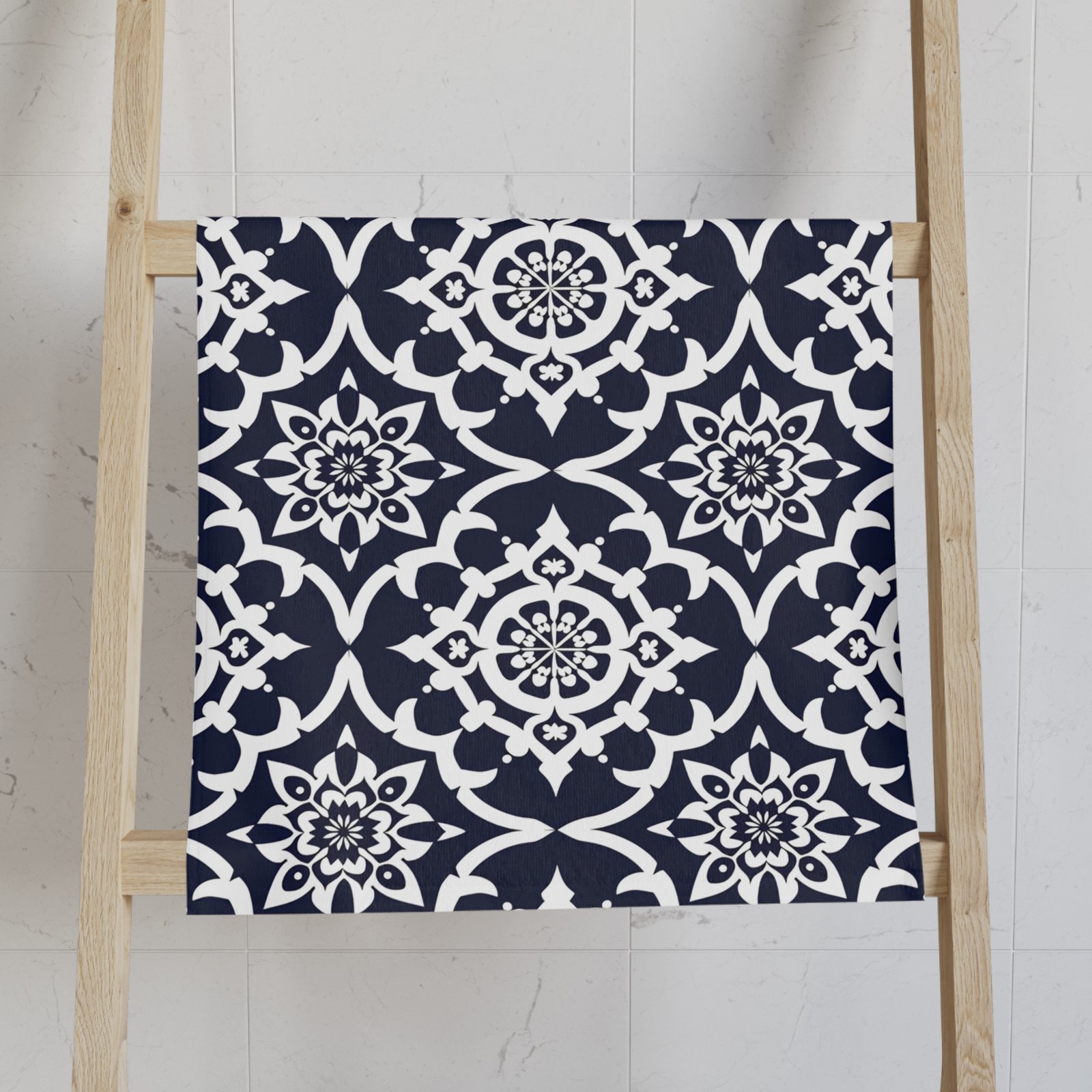 A soft, stylish hand towel that brings quiet sophistication to everyday routines. The deep navy background with crisp white medallion motifs feels both classic and modern — a small splash of pattern that lifts your sink, powder room, or kitchen. Lightweight and quick-drying, the towel hugs hands and dries efficiently without feeling heavy. Toss it on a hook, fold it beside a soap dish, or layer it on a towel bar; it fits naturally into homes that favor thoughtful details and calm, collected design.