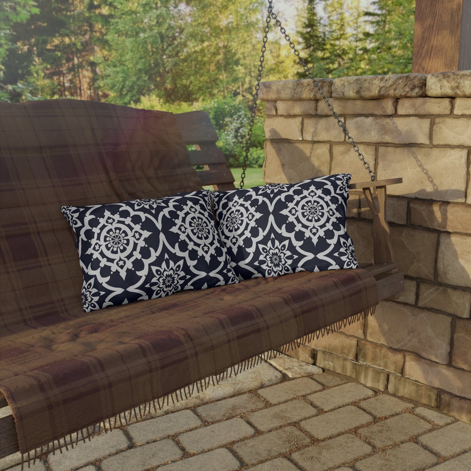 Bring a timeless, coastal-meets-bohemian vibe to your porch, patio, or sunroom with these outdoor pillows. The deep navy and crisp white tile pattern reads both classic and modern — bold enough to anchor a seating area, subtle enough to layer with textured throws. Made to face the elements, they keep their color and shape through sun and splash, staying plush and inviting whether you’re settling in with a book or hosting an evening firepit chat. Let them sit on wicker chairs, mix with woven rugs, or lean against a bench to dial up cozy structure and calm contrast.