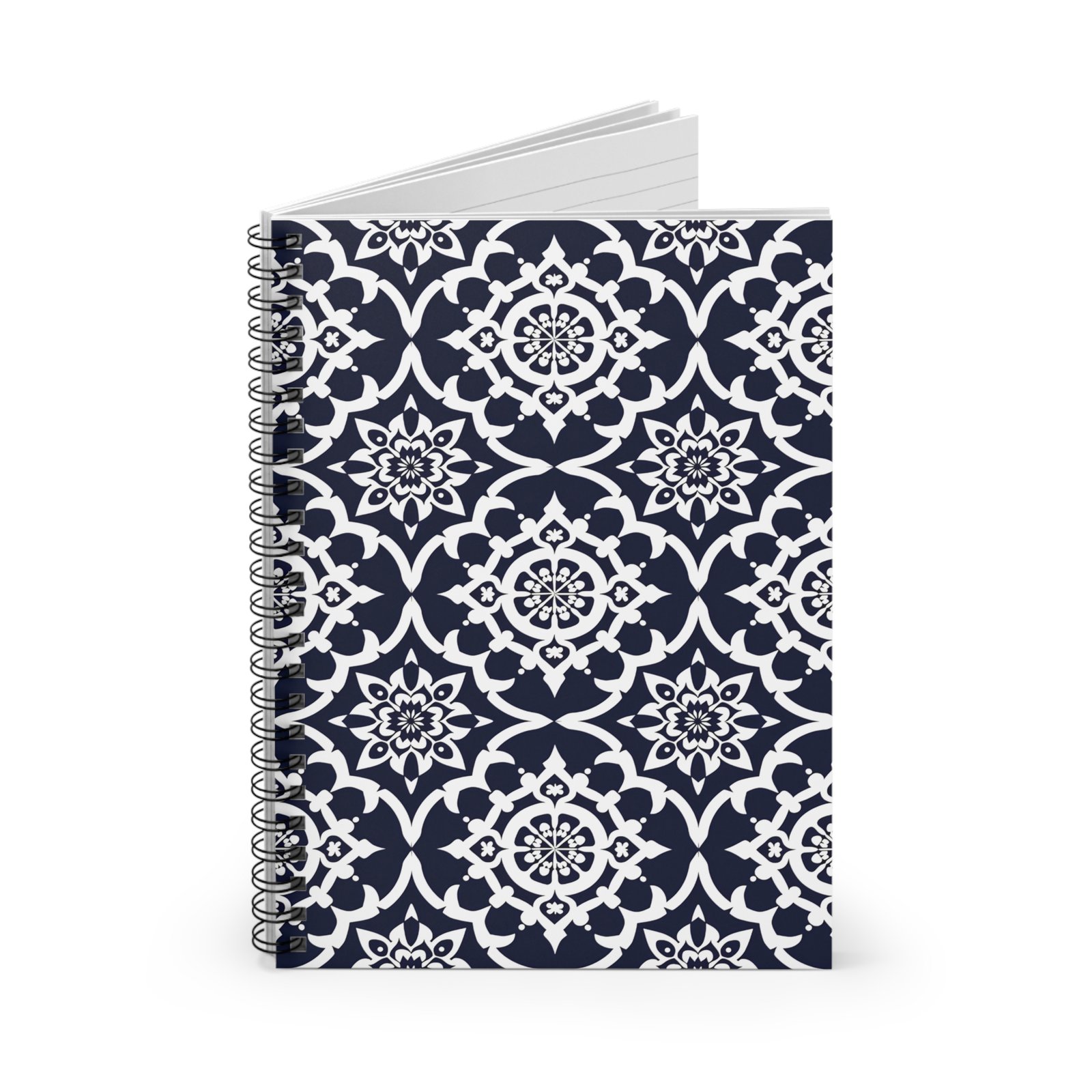 A compact spiral notebook with a timeless navy-and-white tile pattern that quietly elevates everyday notes. The sturdy 350 gsm covers protect 118 ruled pages of smooth 90 gsm paper, so ideas, lists, and sketches glide onto the page without bleed-through. A metal spiral lets the notebook lie flat or fold back for easy writing, and an internal document pocket keeps loose receipts, ticket stubs, or reference pages tucked away. At 6″ x 8″, it slips into tote bags and backpacks, ready for meetings, classes, or moments of inspiration at a café. This notebook feels calm and collected — a little ritual of order for busy days.