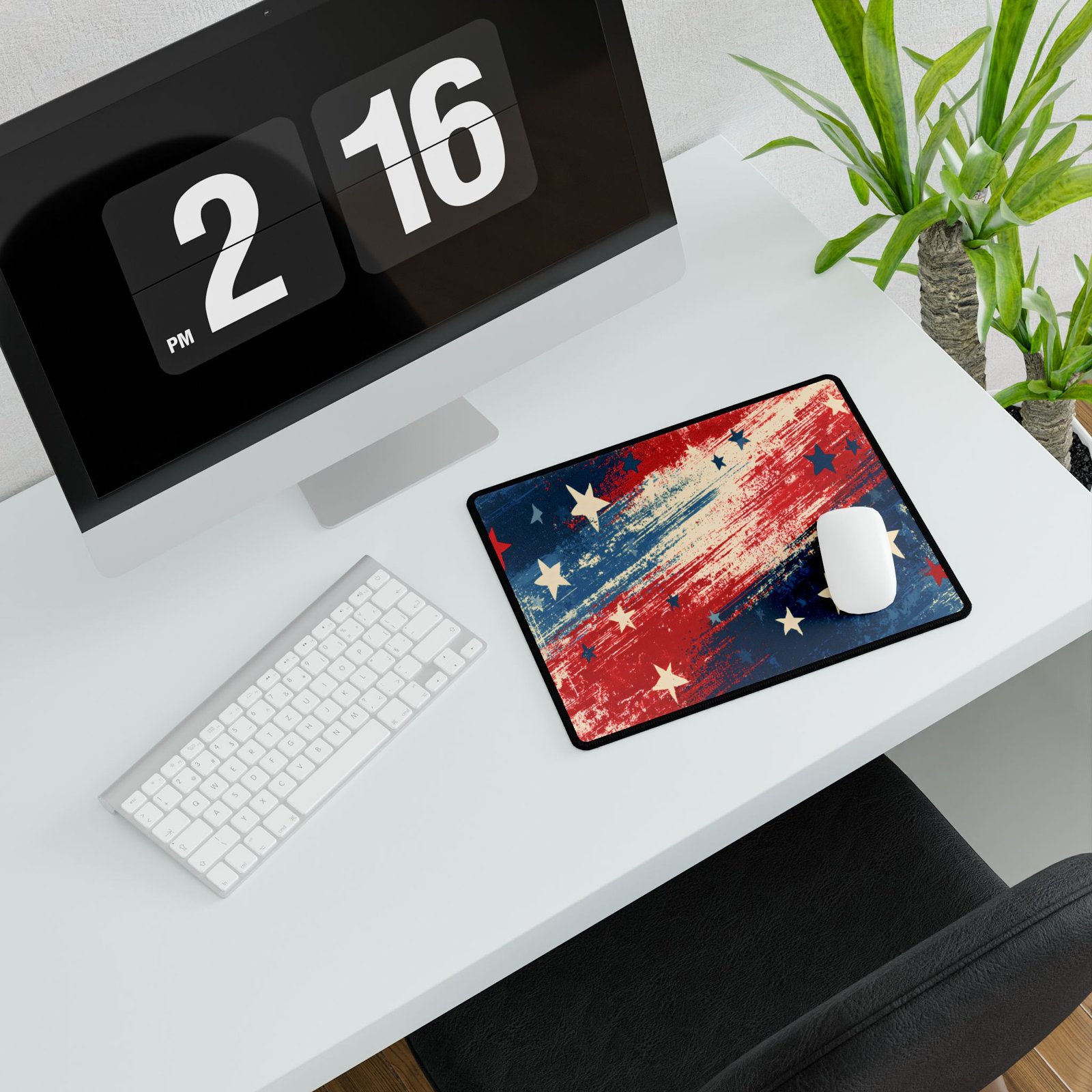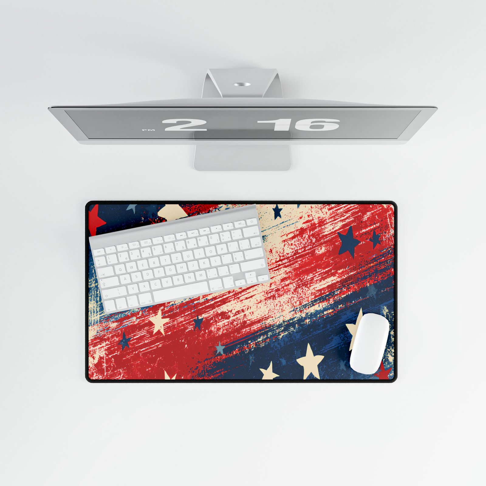 This oversized desk mat brings bold, painterly Americana to your workspace. The rich reds, deep blues, and distressed white stars sit on a smooth, low-friction surface that welcomes both precise mouse work and relaxed browsing. It stretches across keyboard and mouse, creating a cohesive surface that tames cable clutter and adds personality to a home office, gaming nook, or studio. The dense polyester face keeps colors vivid through daily use while the textured natural rubber base prevents slipping during long sessions. Edges are stitched to resist fraying, and the mat’s large footprint doubles as a soft landing for wrists and forearms.