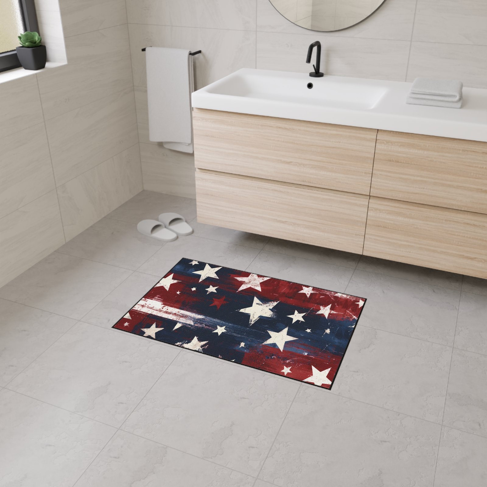 Lay down a little weathered patriotism where it matters most. This heavy duty floor mat brings a rugged, painterly take on the American flag into entryways, kitchens, garages, or porches — a wash of deep navy and worn crimson anchored by distressed white stars. It feels substantial underfoot without being bulky, and the low-profile design lets the textured print do the talking while protecting floors from dirt and wet shoes. It pairs with casual, lived-in spaces and outdoor-inspired decor, and it settles into busy households that want usable style with an Americana edge.