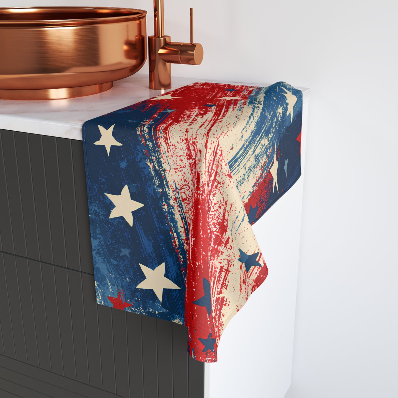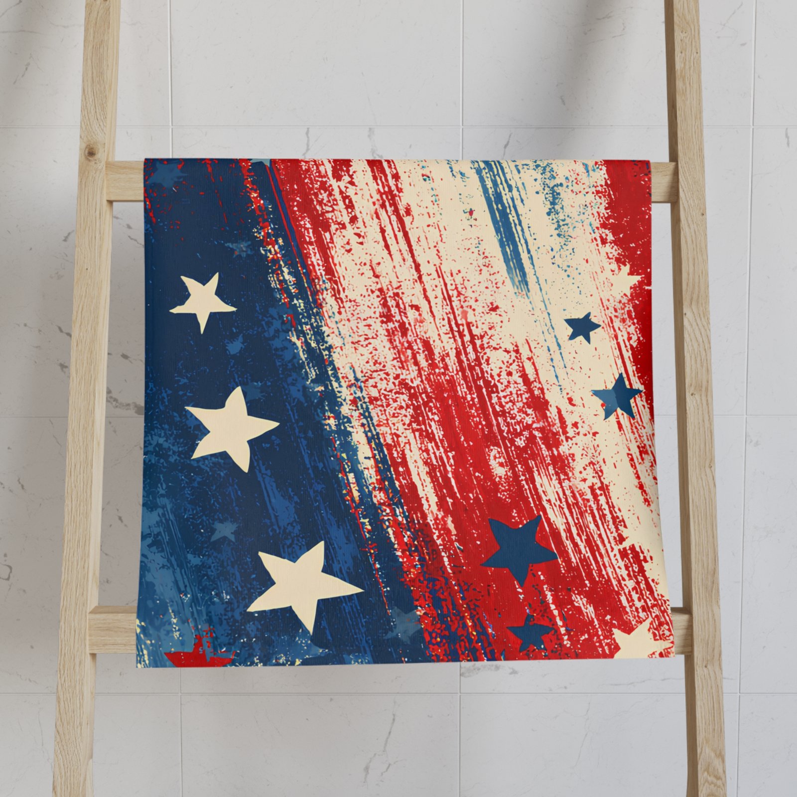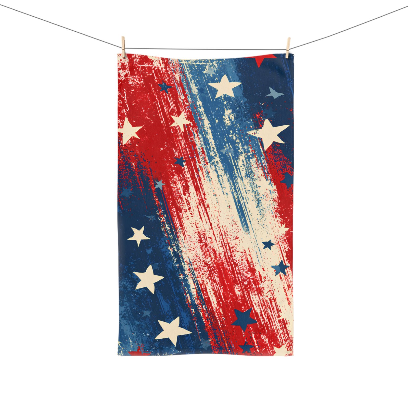 Bring a splash of spirited color to your kitchen or outdoor gathering with this soft, patriotic hand towel. The bold brushstroke pattern in red, white, and blue, scattered with distressed stars, feels lively and a little worn-in — like a favorite banner after a long summer of celebrations. Lightweight and quietly absorbent, it slips into daily routines easily: wiping picnic tables after a barbecue, drying hands between canning jars, or adding a festive layer to your holiday prep. The single-sided print keeps the design vibrant where it shows most, while the fabric blend resists shrinking and stays breathable. This towel sits comfortably in the hands of someone who likes useful pieces with personality — practical, colorful, and ready for every backyard get-together and flag-day moment.