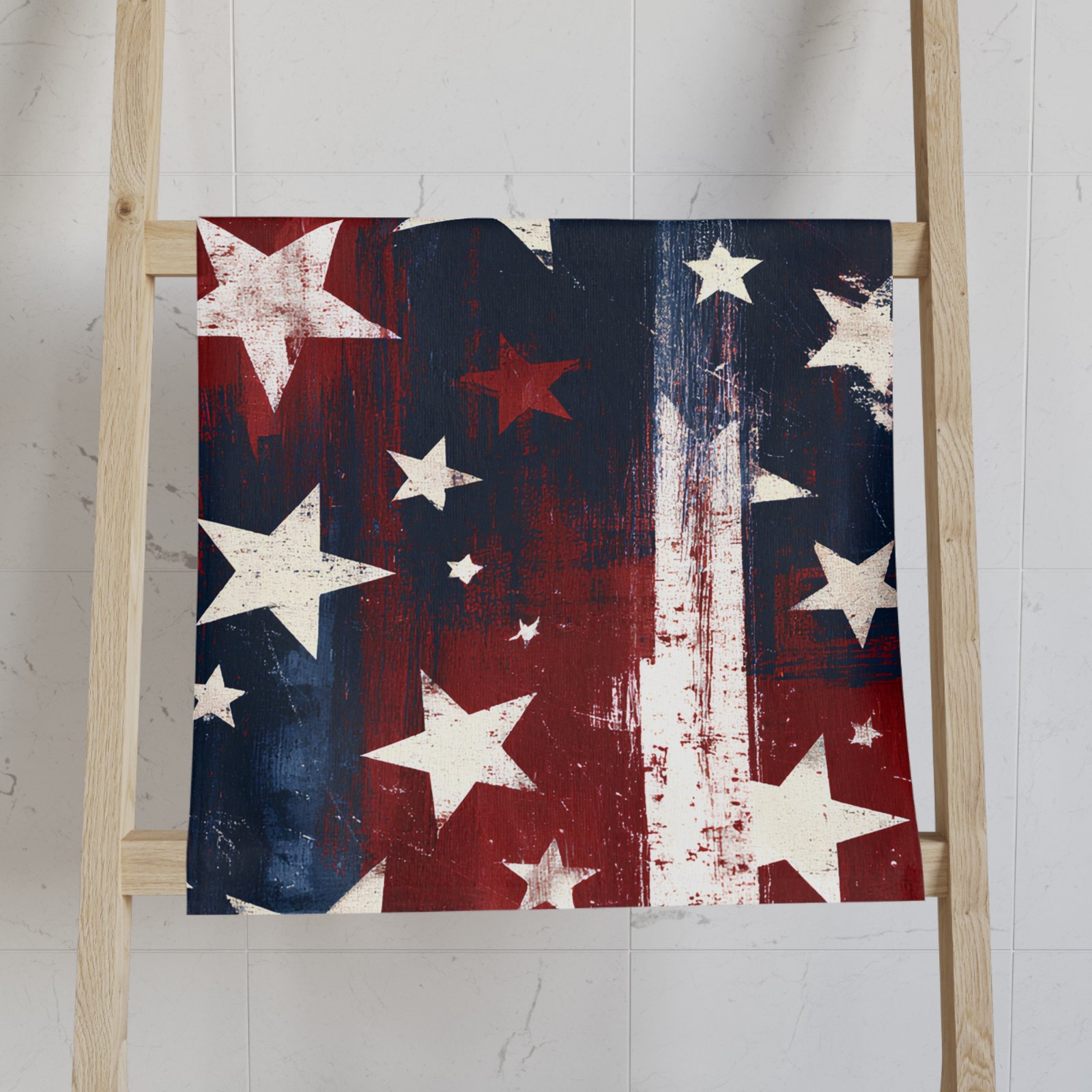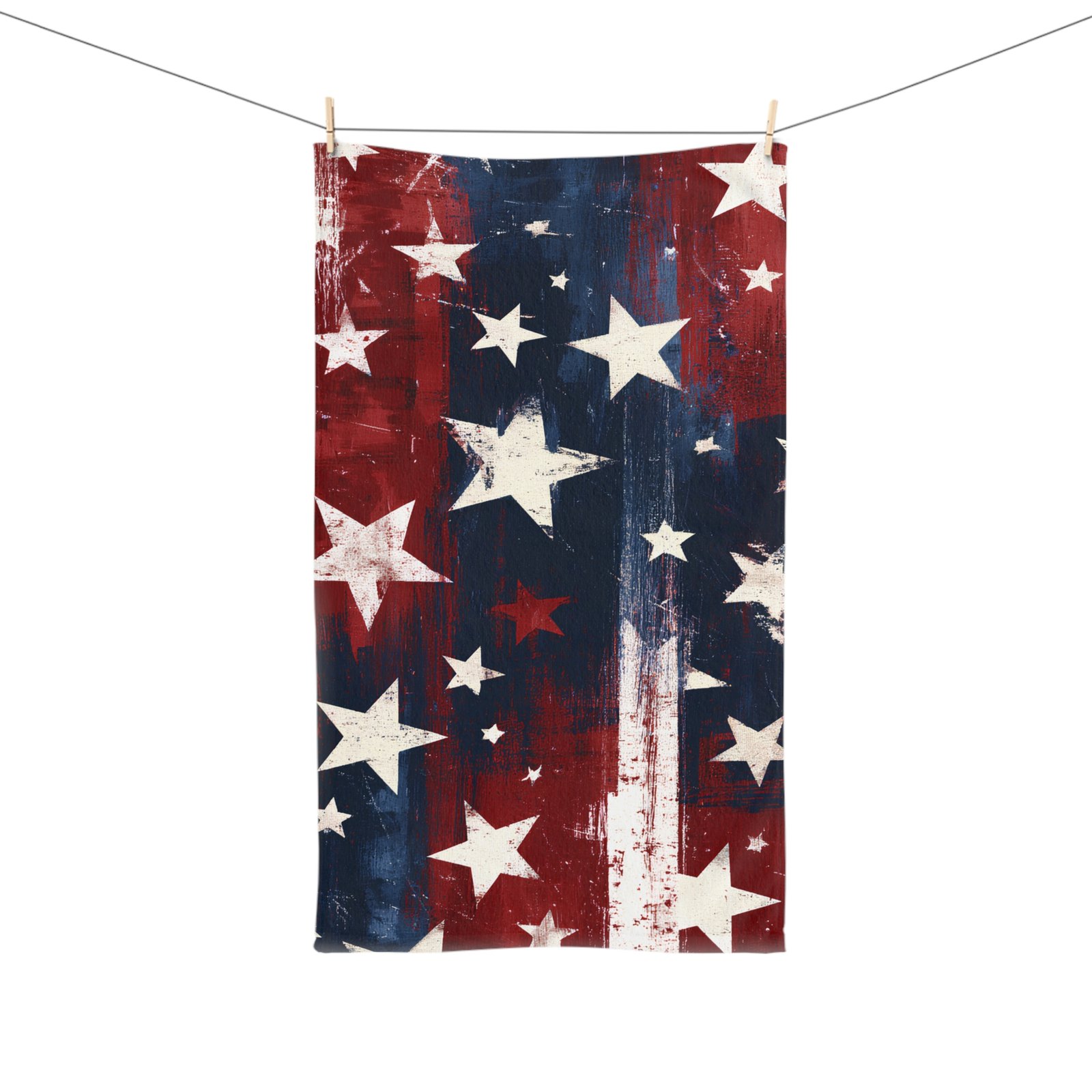 Worn-in Americana with a soft edge. This hand towel brings a painterly, stars-and-stripes look to your kitchen or patio — splattered reds and deep indigo streaks that feel lived-in, not manufactured. It’s lightweight and gentle on skin, so it’s the towel you grab to dry hands after washing up at a summer cookout, wipe a picnic table, or add a dash of vintage patriotism to a lakeside cabin. The single-sided print keeps the pattern crisp where it shows, while the durable polyester-cotton blend keeps shape and color through frequent use and quick drying.