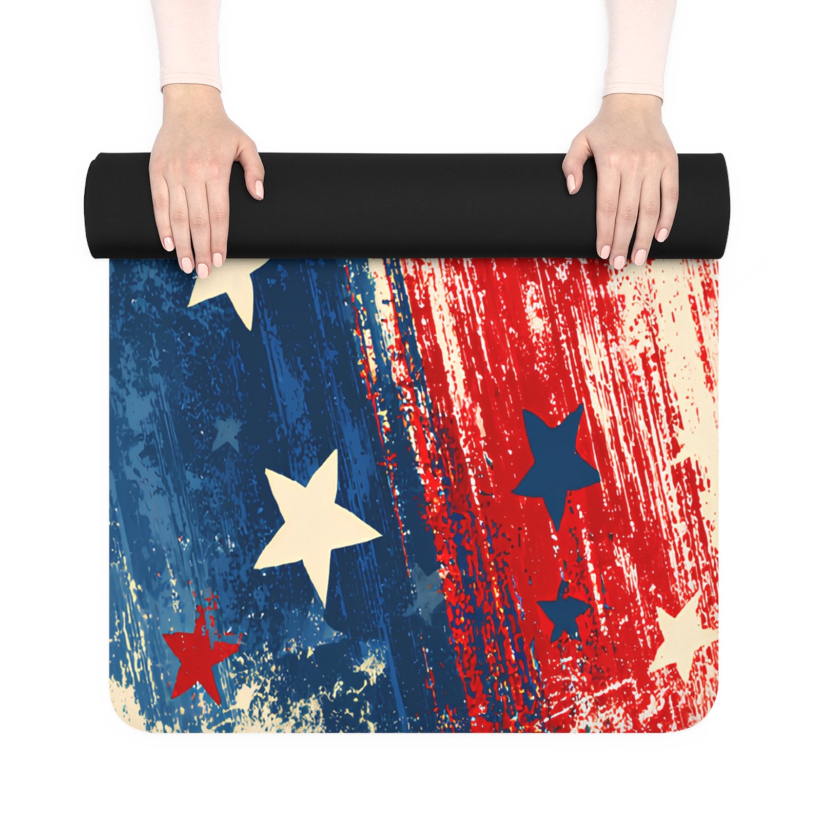 Breathe in steady courage and stretch into stance. This lightweight rubber yoga mat brings a worn-star, brushstroke design in deep navy, patriotic red, and cream right under your hands and feet. The microfiber suede top feels soft against skin and grips when you flow through standing balances; a natural rubber bottom and anti-slip backing keep the mat planted on hardwood, studio floors, or a sunlit deck. At 24″ x 70″ and 3mm thick it’s slim enough to fold into a travel routine yet cushioned enough for daily practice. Roll it up, secure the included black polyester strap, and take your practice outside for sunrise flows, backyard cooling stretches after a run, or mindful grounding before a long day. Avoid prolonged direct sunlight to help preserve the vivid edge-to-edge print.
