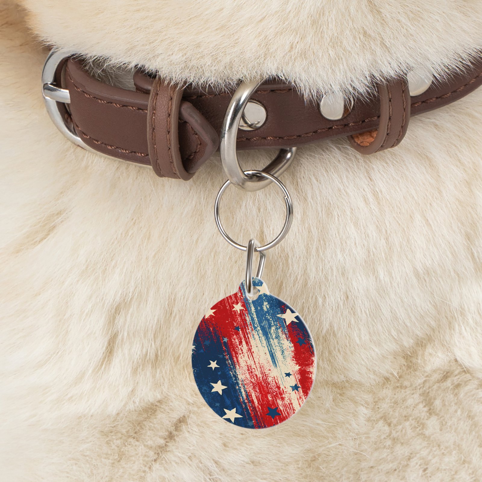 A cheerful, worn-flag pet tag that brings a touch of summer backyard barbecues and neighborhood parades to your furry friend. The brushed, painterly stars-and-stripes design reads like a fast vacation memory—bright reds and deep navy, softened by a lived-in texture. Lightweight and glossy, it catches the sun when your pup trots by and stays securely attached with the included metal clip. Let this small round tag add personality and a dash of Americana to daily walks, holiday outings, or lazy porch afternoons.