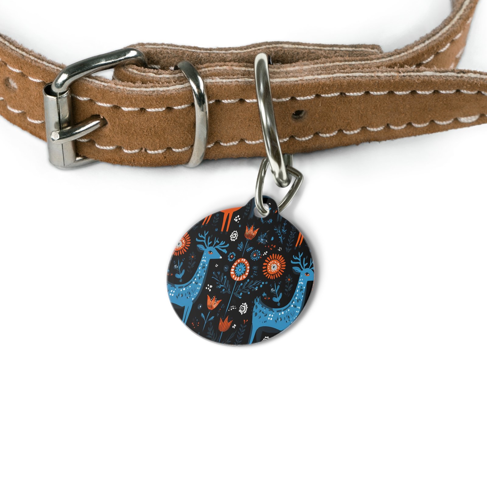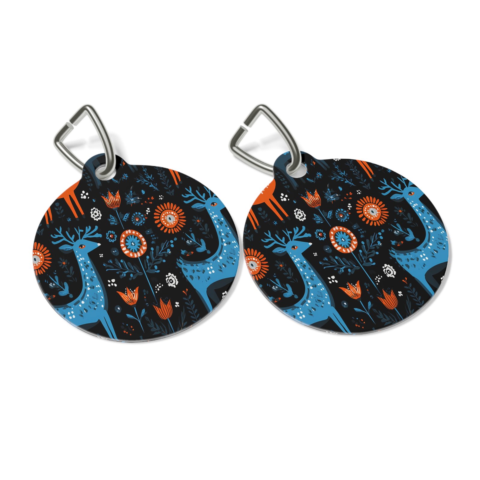 Personalized pet tags provide a fresh way to spice up a furry friend’s collar. The tag and clip are both made of metal. This increased durability comes in handy, as collar pieces can snag on brush, corners, etc. The base color is white, giving designs an even printing surface. Both sides are flattened.