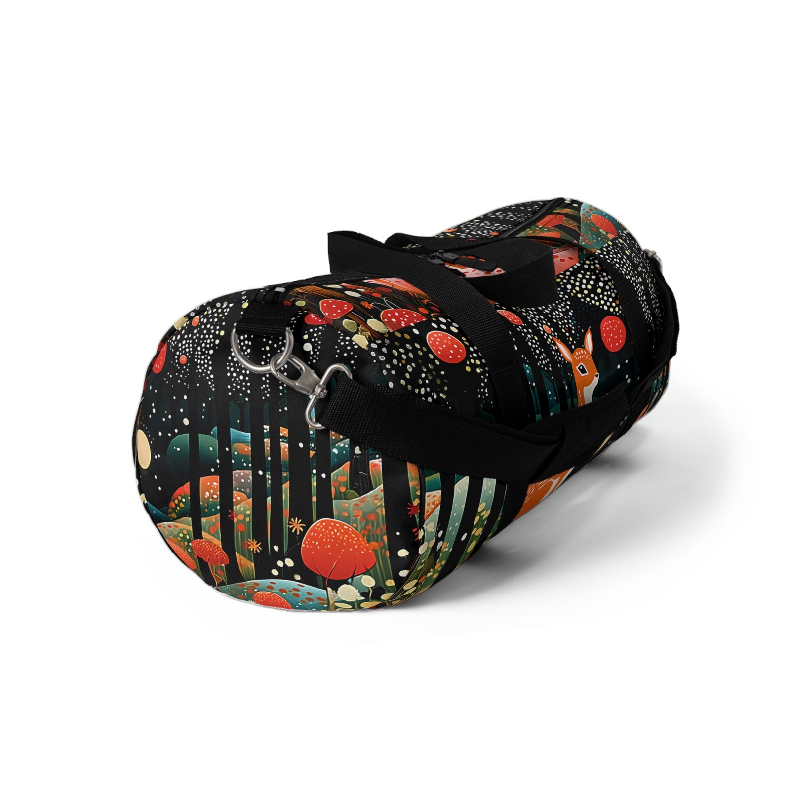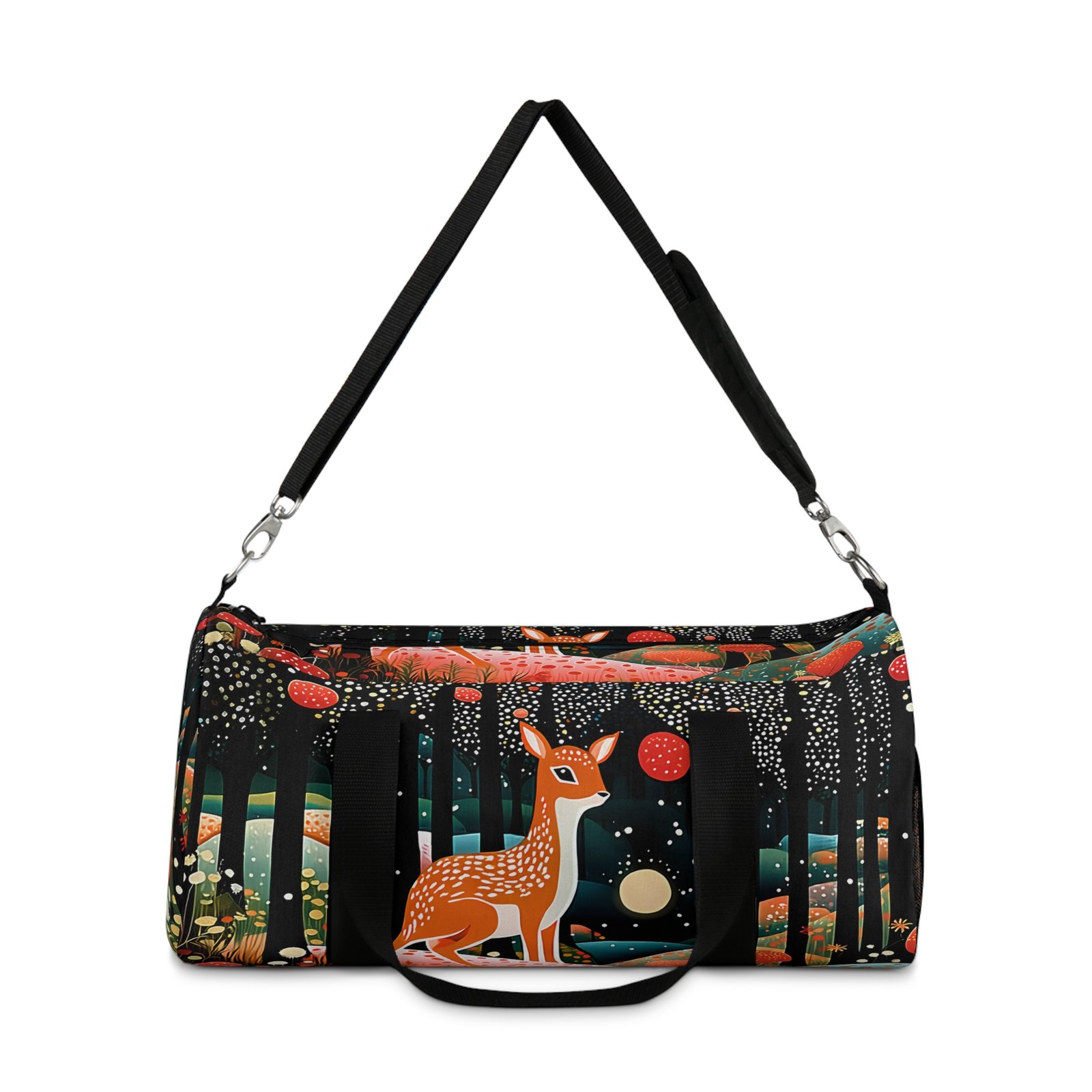 This stylish Duffel Bag combines functionality with aesthetic appeal. It features a whimsical design of a deer surrounded by a magical forest, making it perfect for nature lovers. The spacious main compartment is easily accessible, allowing you to store your essentials securely. With numerous pockets, including a secondary interior zipper pocket and an exterior mesh side pocket, you can keep everything organized on your travels. The adjustable shoulder strap offers comfort during long journeys, while the durable polyester fabric ensures longevity and easy maintenance.